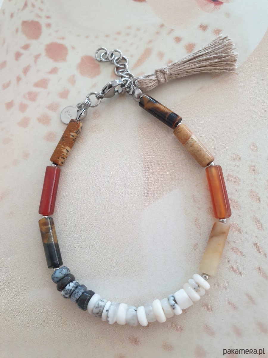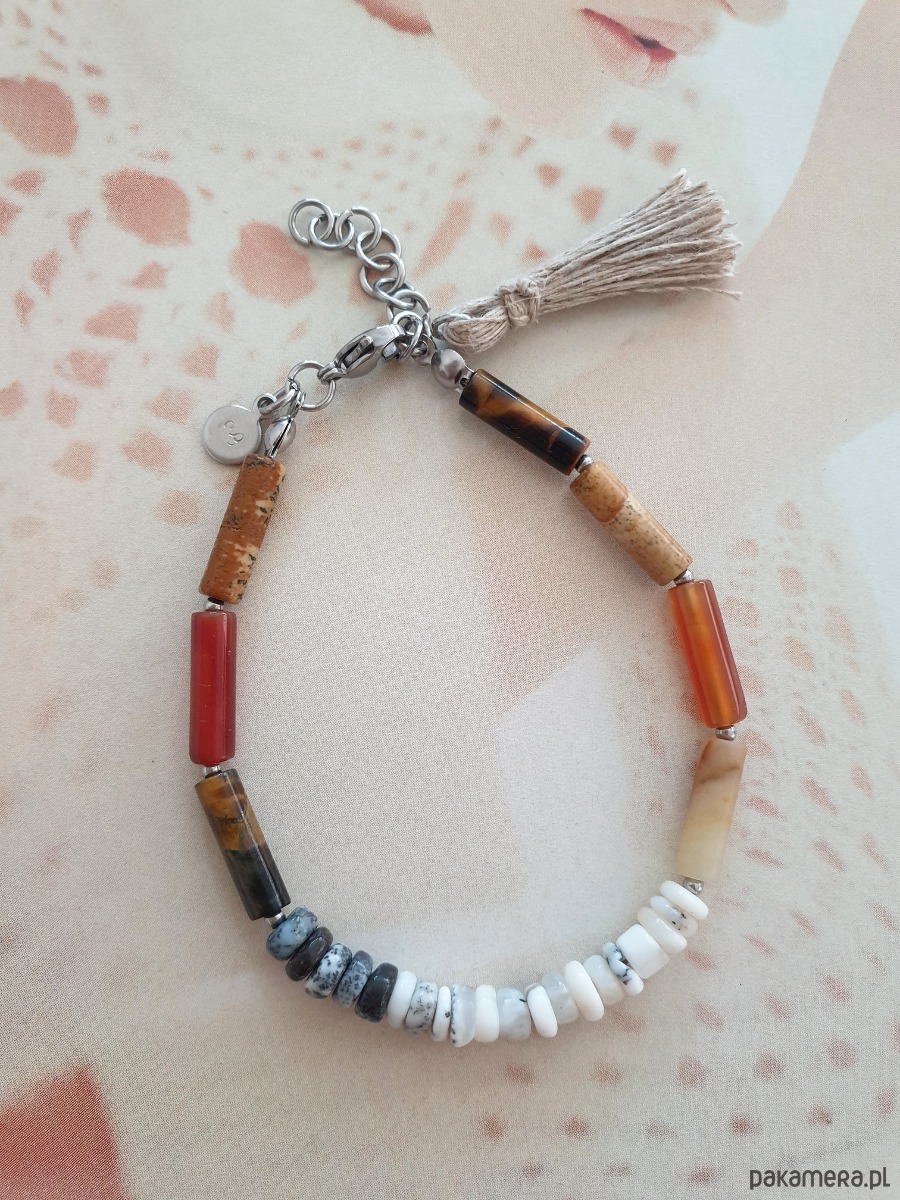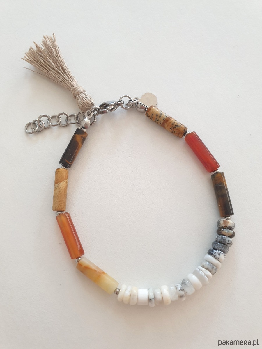 Minimalistyczna bransoletka tworzona ręcznie z kamieni naturalnych, elementów ze stali szlachetnej (antyalergicznej) i lnianego chwosta. W tej - patyczki agat, jaspis obrazkowy, tygrysie oko, amazonit oponki opal dendrytowy.