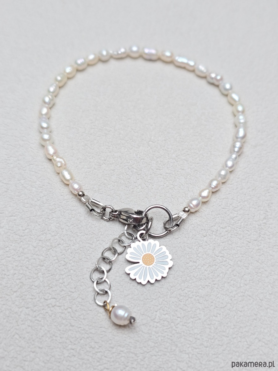 Delikatna bransoletka z małych naturalnych perełek, z uroczą zawieszką stokrotką.