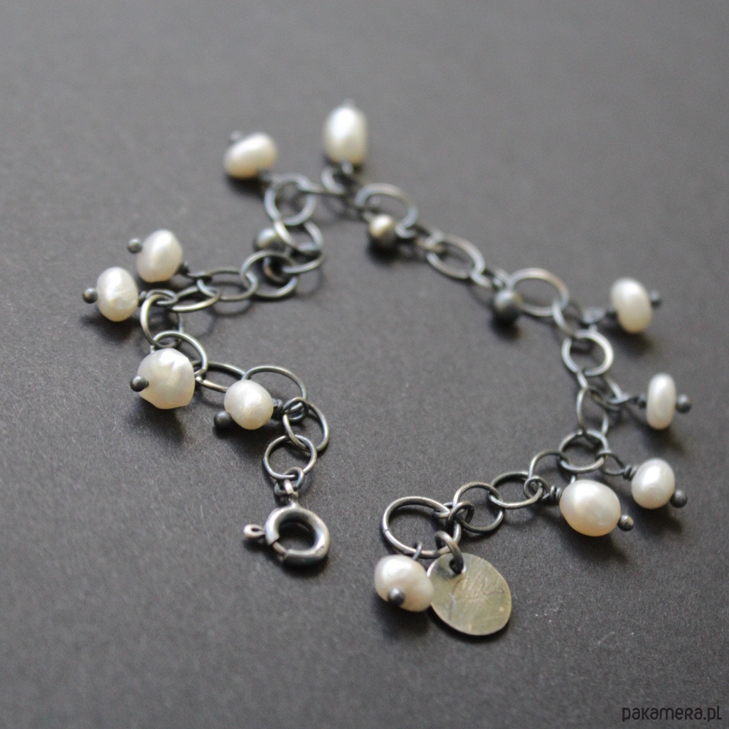 Bransoletka wykonana została z oksydowanego srebra oraz naturalnych perełek hodowlanych wielkości 0,5-0,7 cm.