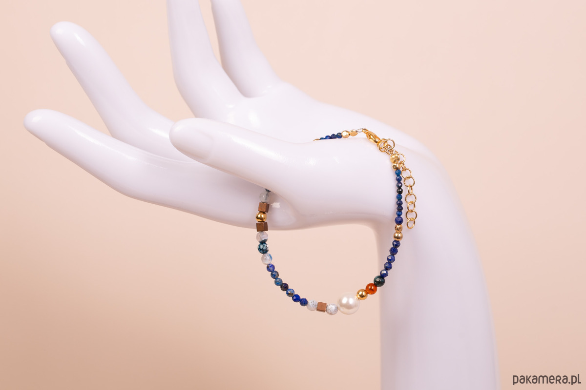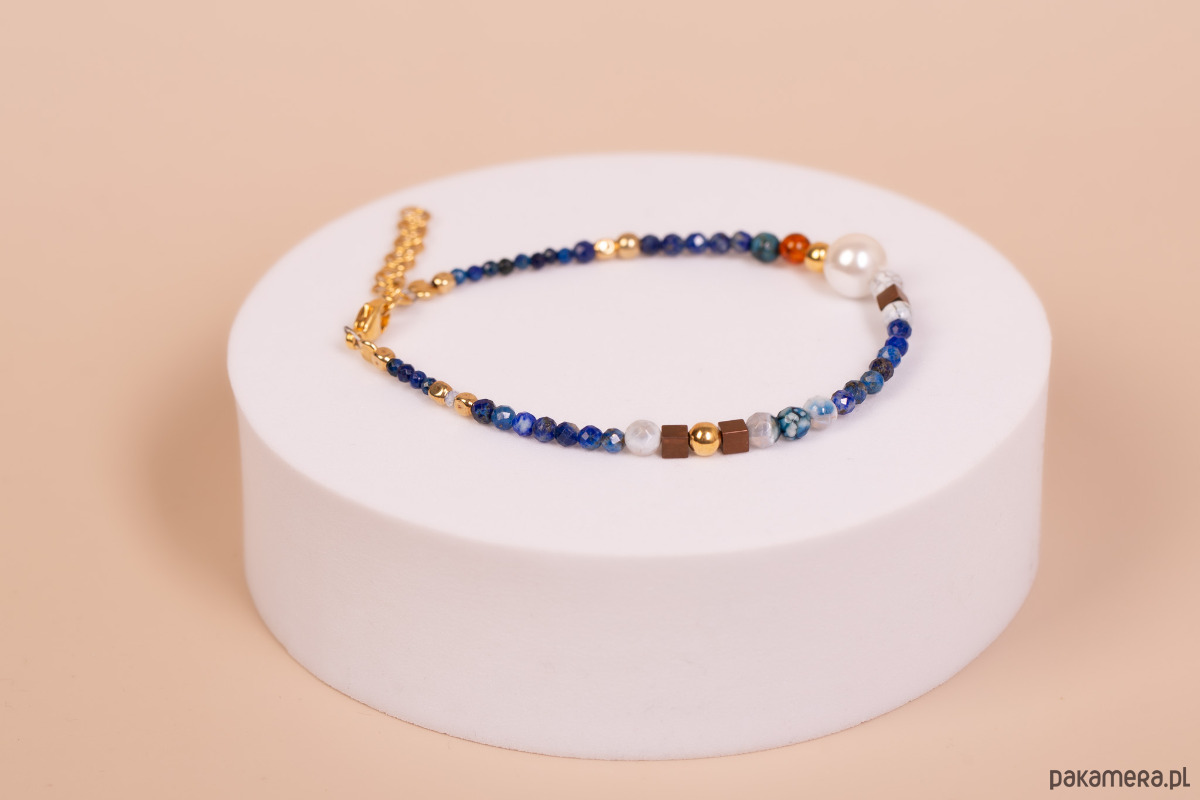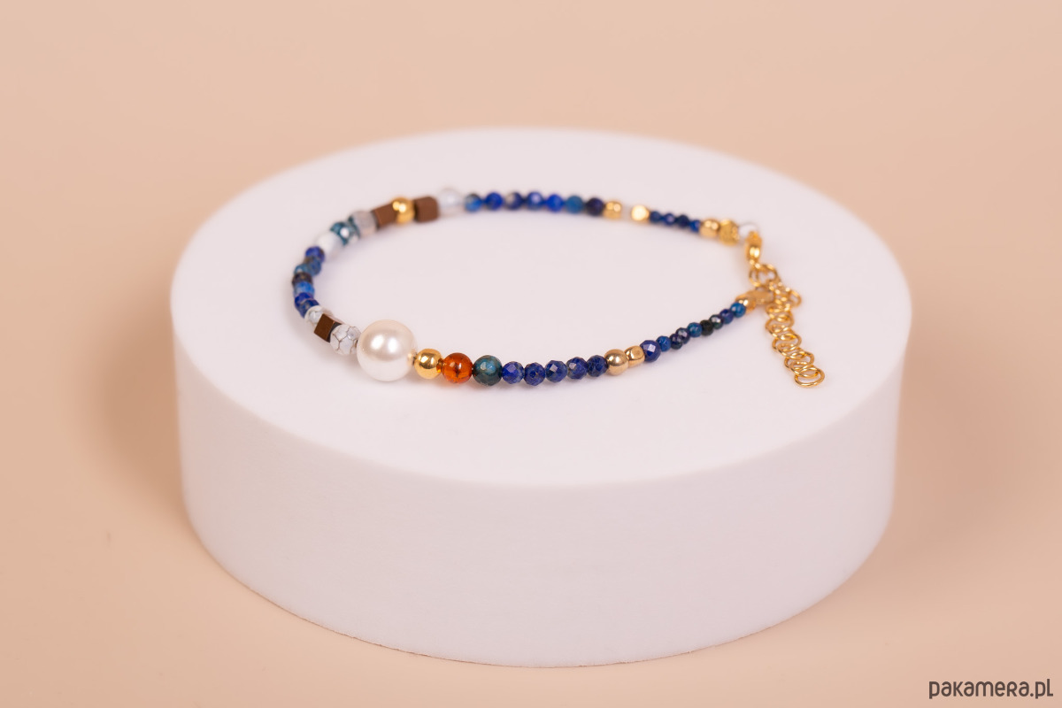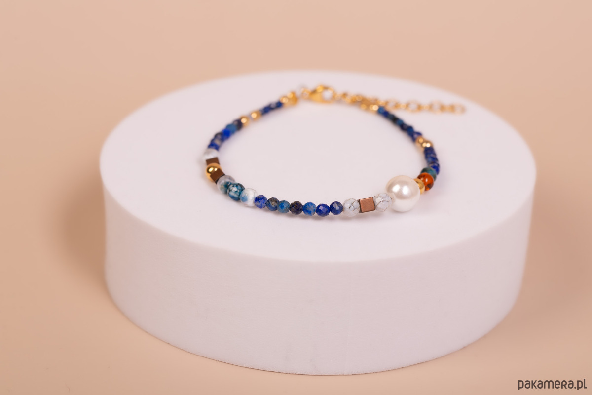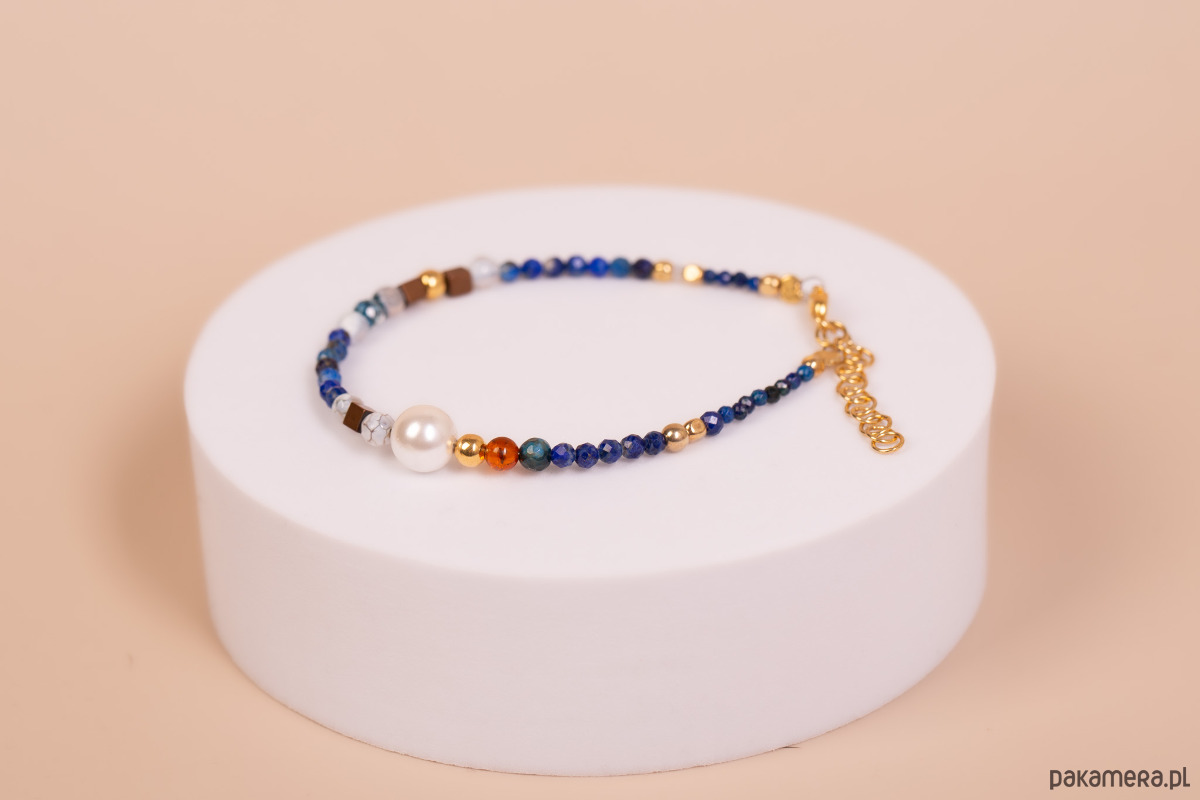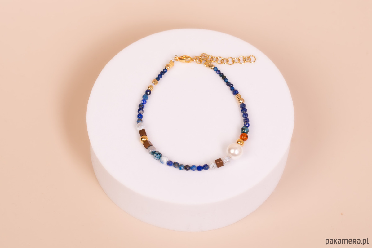 Artystyczna bransoletka na stalowej lince, będąca bogatą kompozycją barw i naturalnych tekstur. Centralnym punktem projektu jest lśniąca perła hodowlana, obok której umieszczono słoneczną kulkę bursztynu bałtyckiego. Całość dopełnia sznur drobnych kamieni: głębokiego lapis lazuli oraz howlitu o unikatowym, marmurkowym wzorze w odcieniach bieli i błękitu.