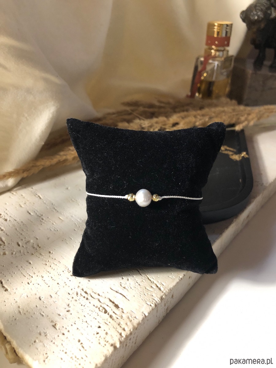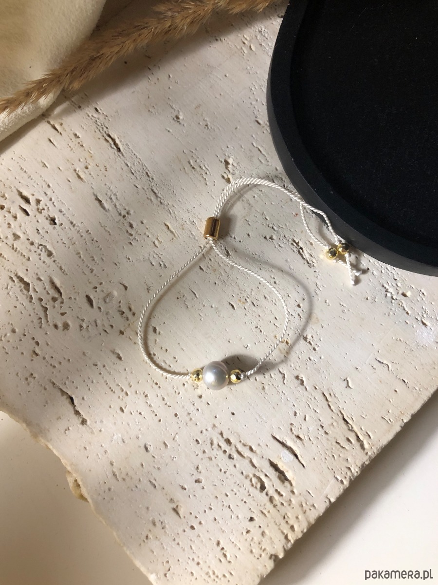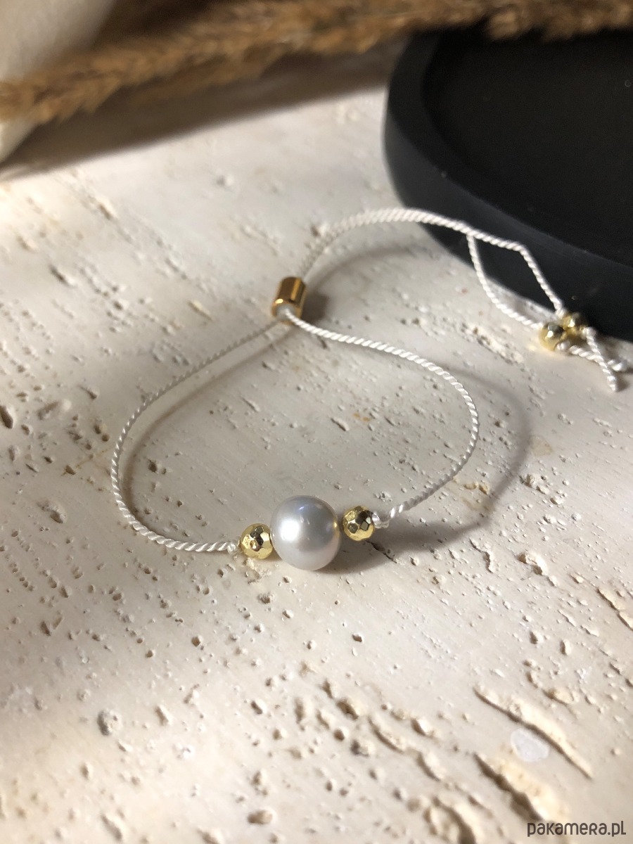 Bransoletka wykonana z perły i naturalnych kamieni. Rozmiar bransoletki można regulować za pomocą stopera z gumką w środku. Na nić jedwabną nawleczono perłę hodowlaną i kamienie hematytu platerowanego o średnicy 4 mm.
