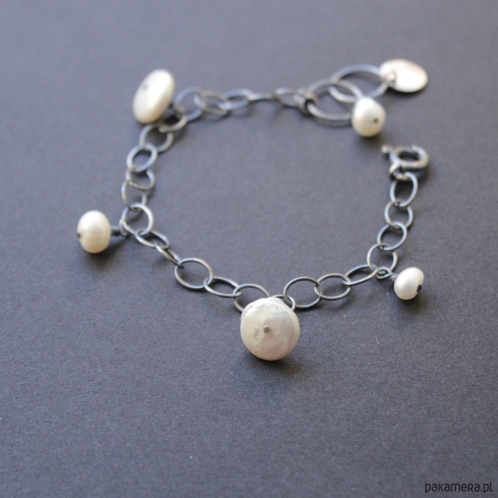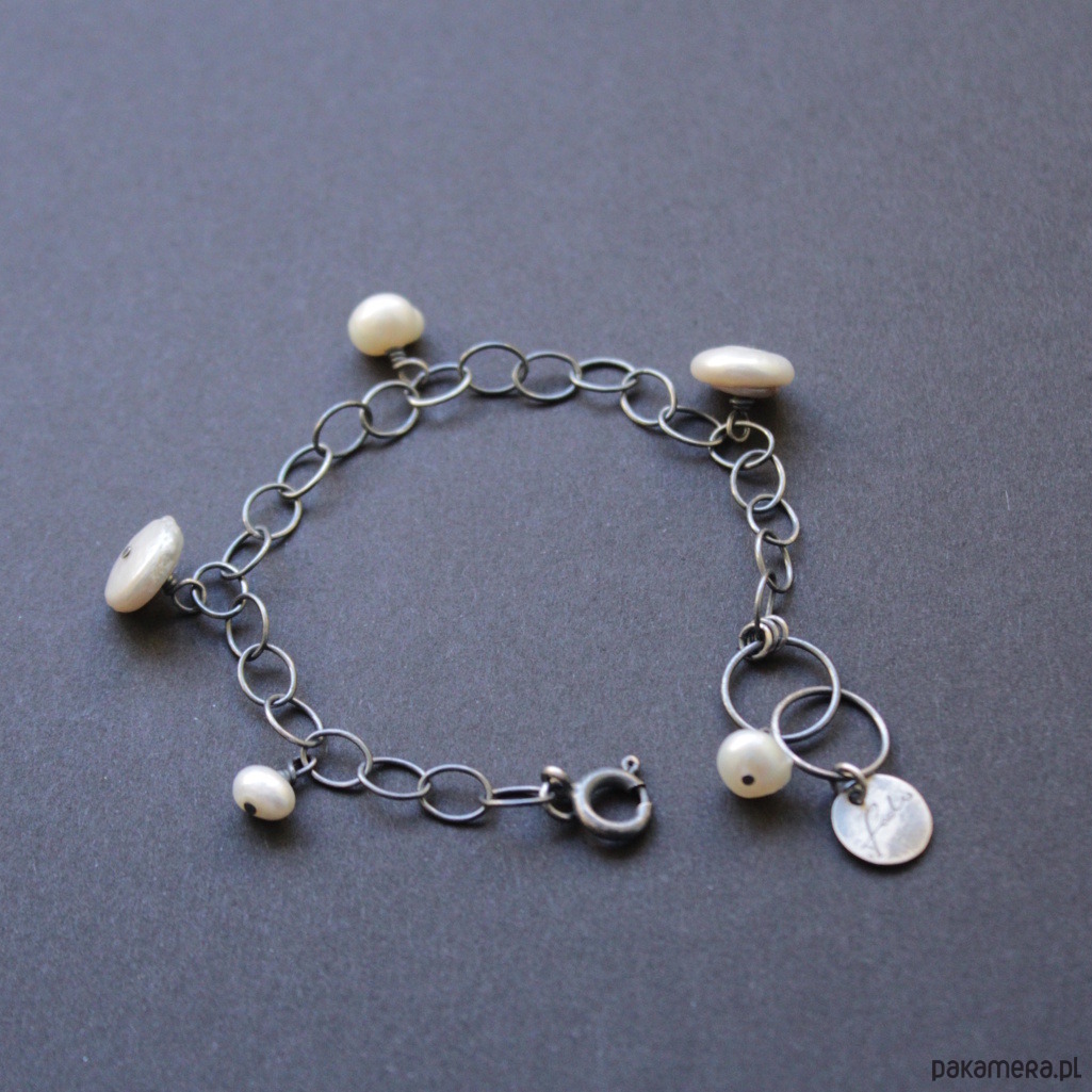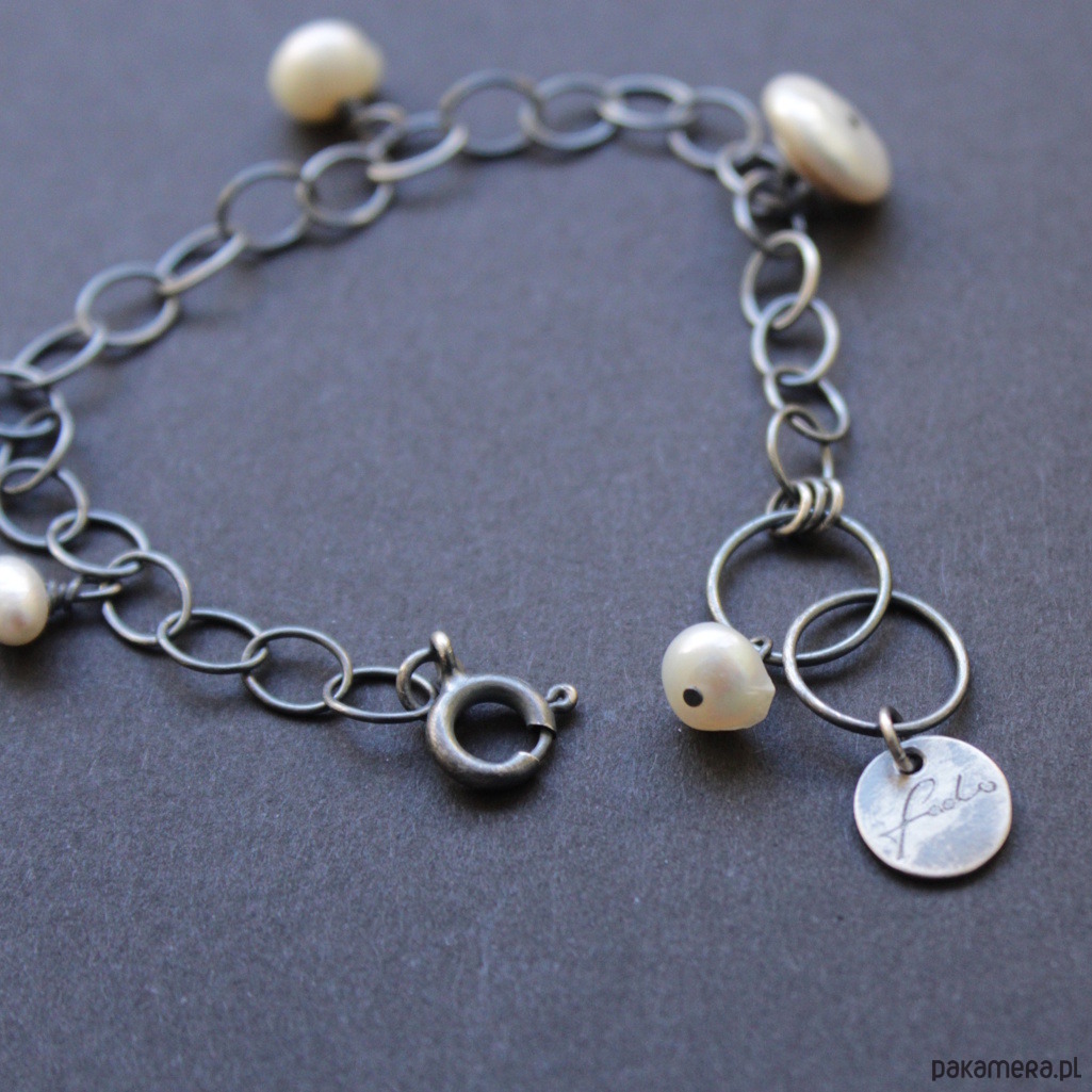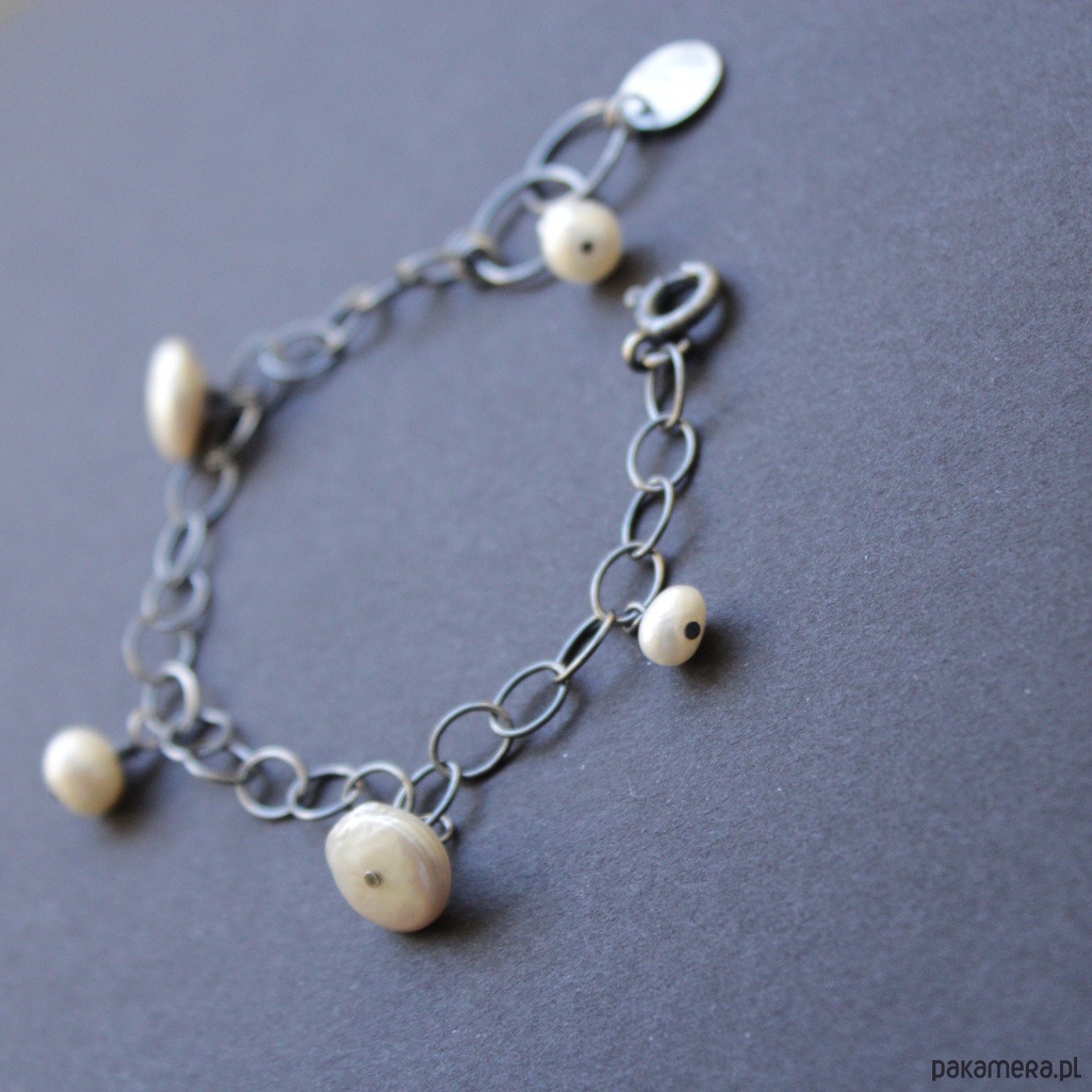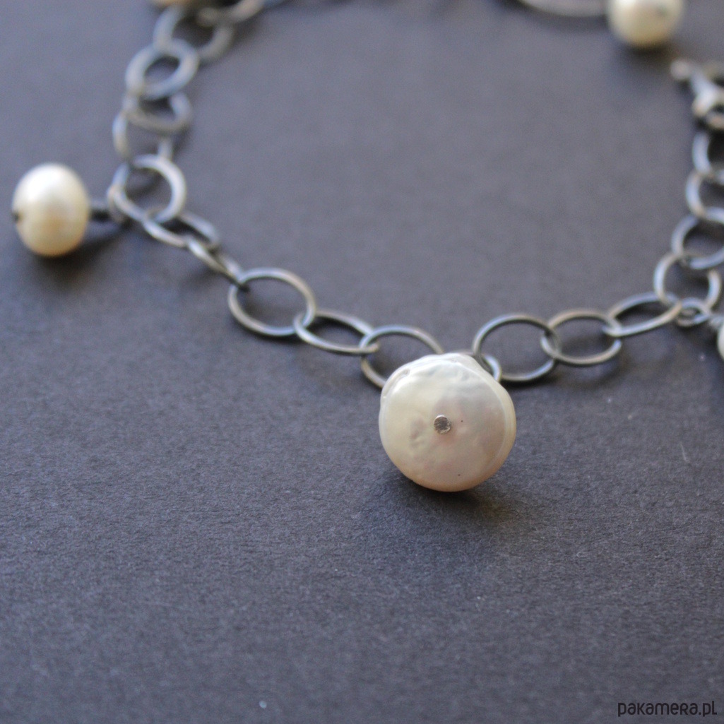 Bransoletka wykonana została z oksydowanego srebra oraz naturalnych perełek hodowlanych wielkości 0,4-0,9 cm.