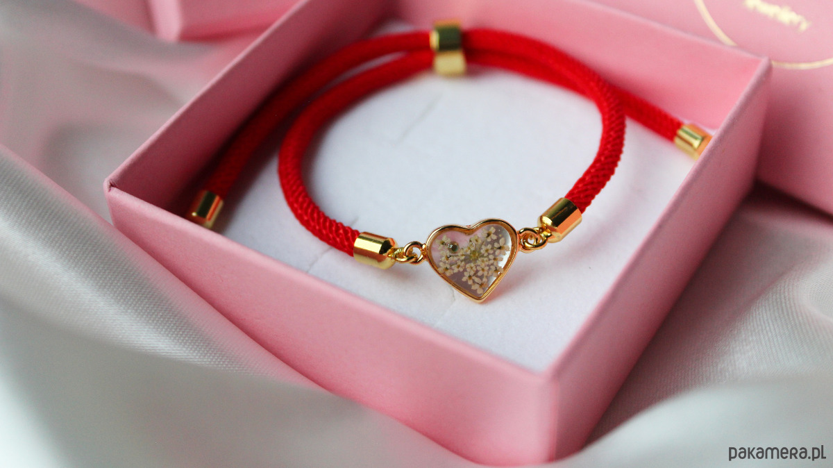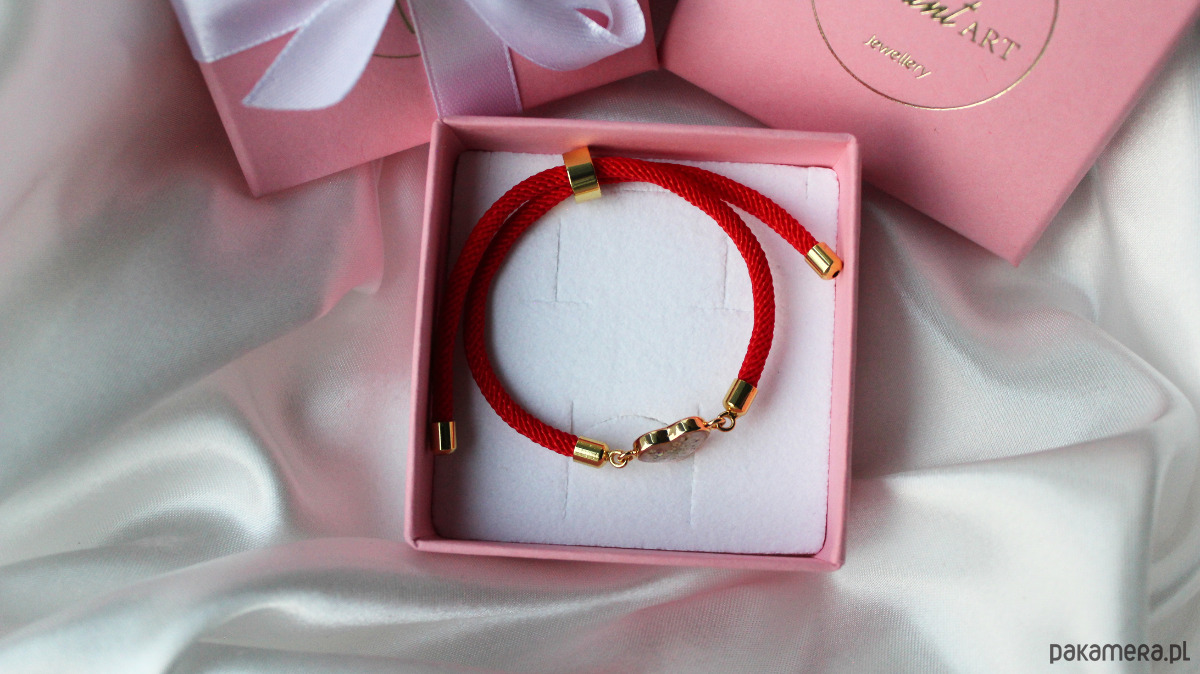 Ozdobne zapięcie z regulacją, składa się z 2 sznurków w kolorze czerwonym po 10 cm. Na sznurkach zamontowana jest przesuwna metalowa oponka 8x4 mm, która służy do regulowania długości bransoletki oraz jako blokada zapięcia