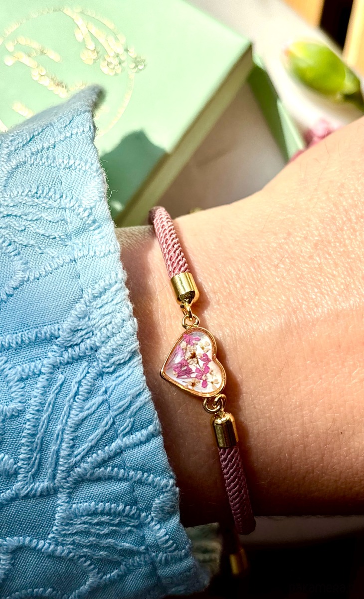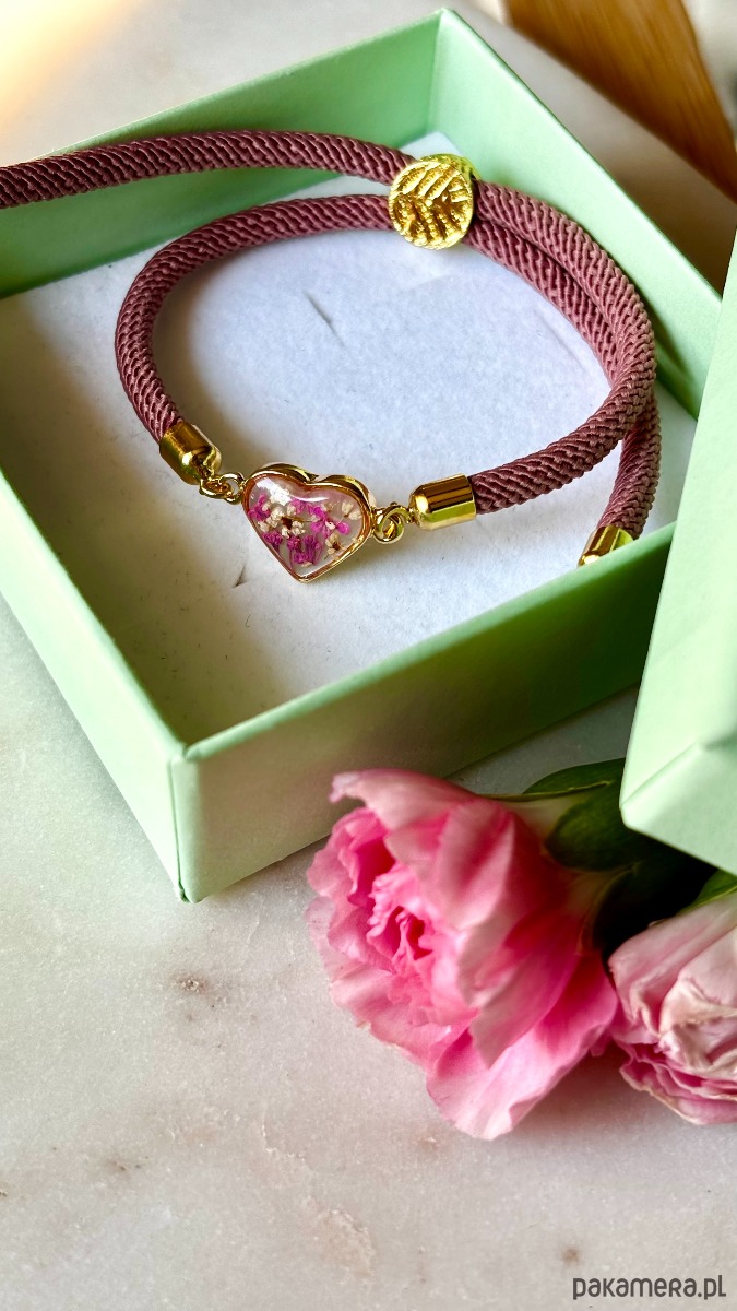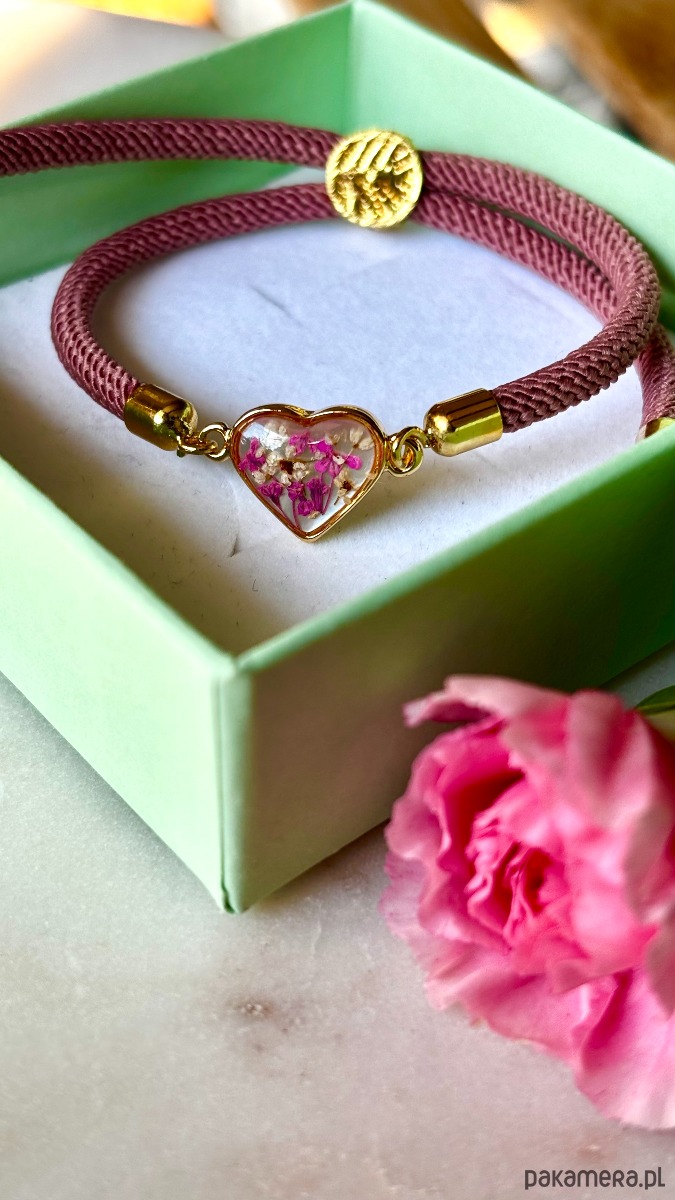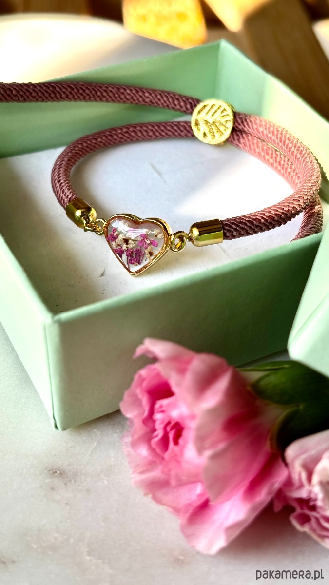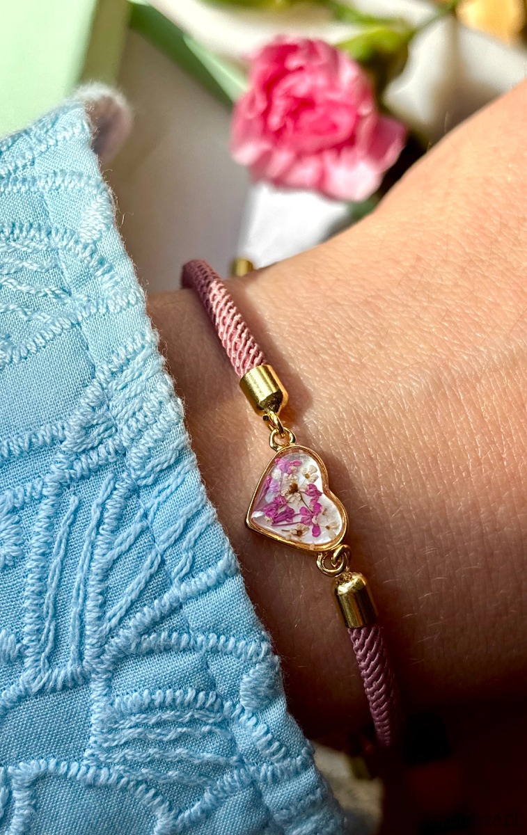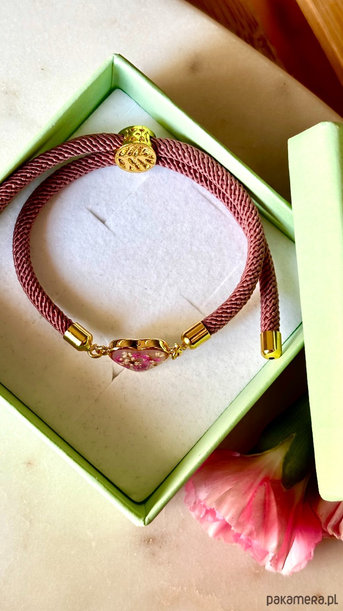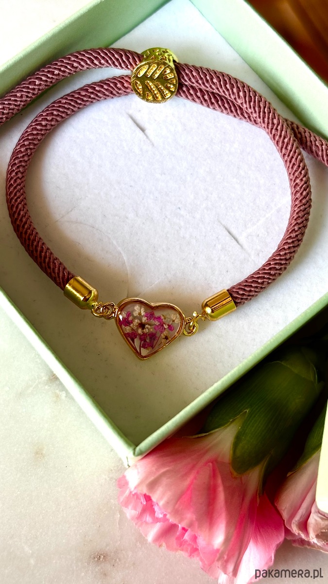 Ręcznie wykonana bransoletka z prawdziwych kwiatów i naturalnych elementów.