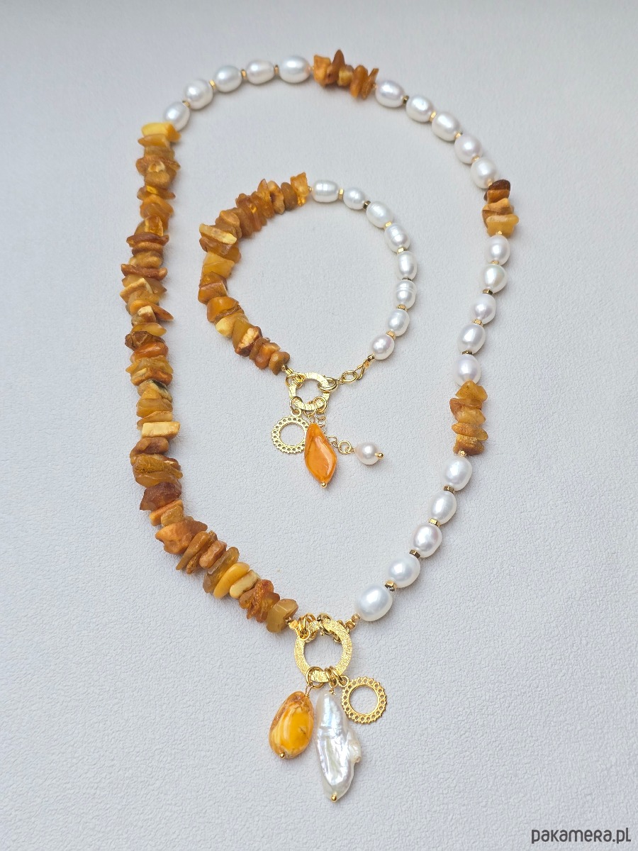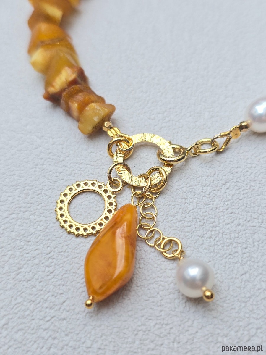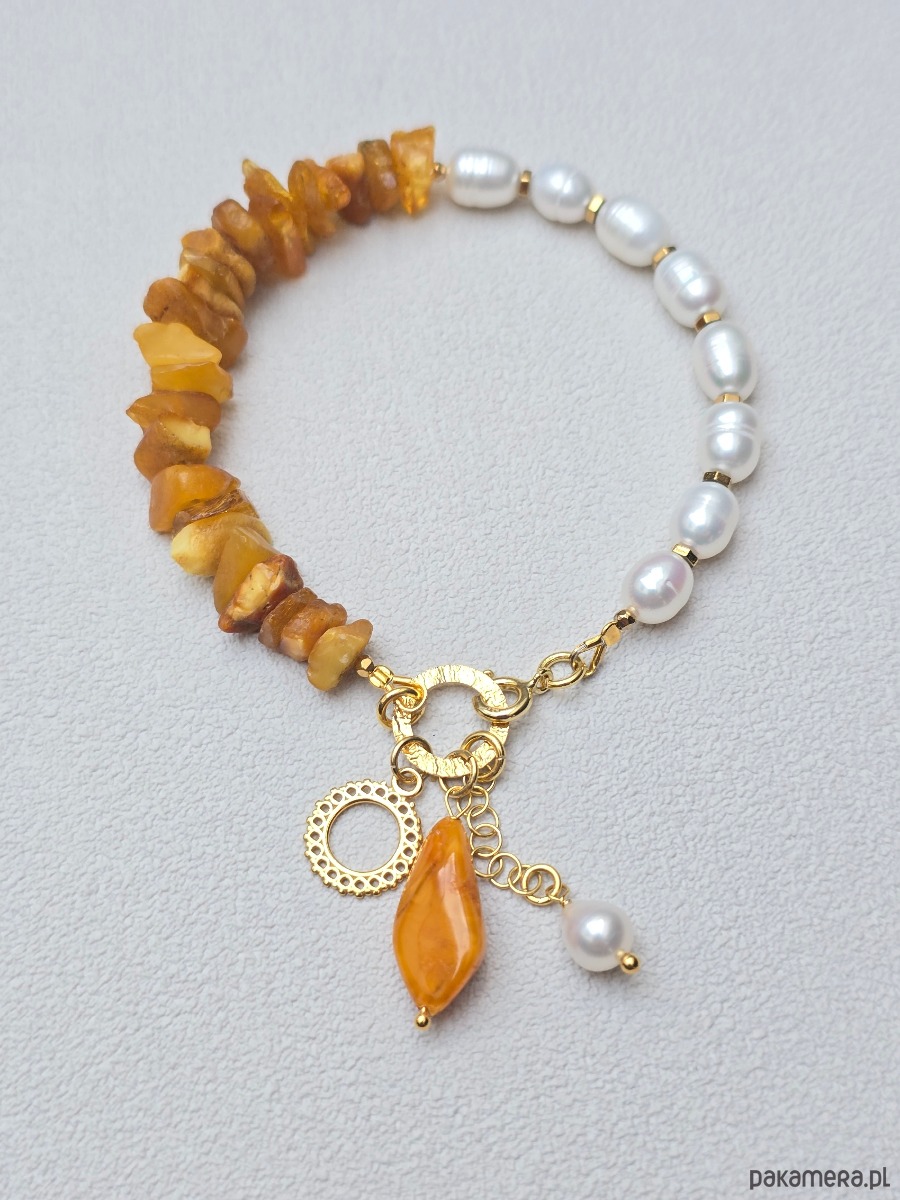 Unikatowa bransoletka z naturalnych pereł i bursztynu o średnicy ok 8mm.