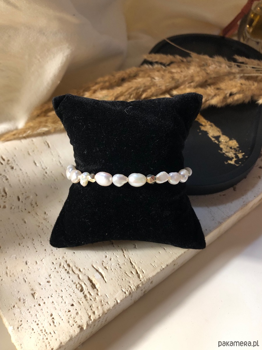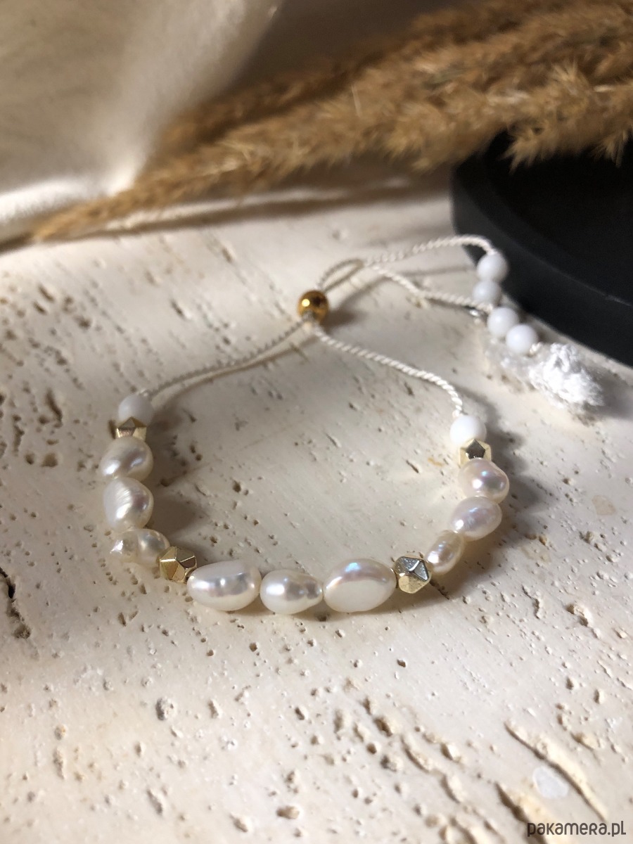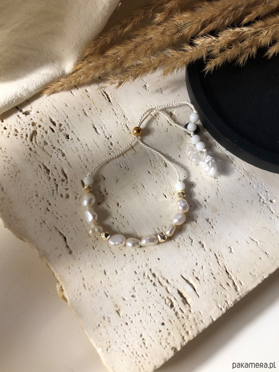 Bransoletka wykonana z naturalnych kamieni i hodowlanych pereł. Rozmiar bransoletki można regulować za pomocą stopera z gumką w środku. Na nić jedwabną nawleczono białe perły oraz złote kamienie hematytu platerowanego o średnicy 4 mm.