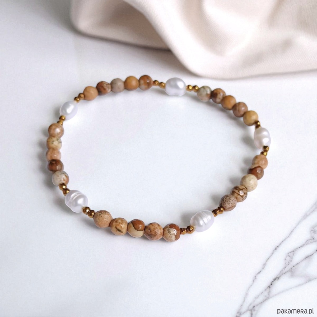 Cudna bransoletka na solidnej lince elastycznej, wykonana z jaspisu krajobrazowego w odcieniach beżu i brązu (fasetowane kule 4mm), pereł słodkowodnych, fasetowanego hematytu.