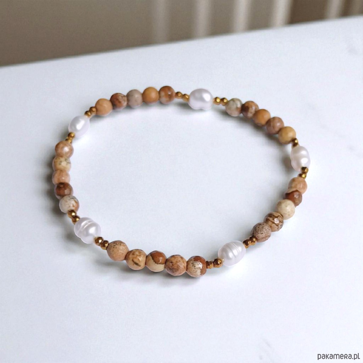 Cudna bransoletka na solidnej lince elastycznej, wykonana z jaspisu krajobrazowego w odcieniach beżu i brązu (fasetowane kule 4mm), pereł słodkowodnych, fasetowanego hematytu.