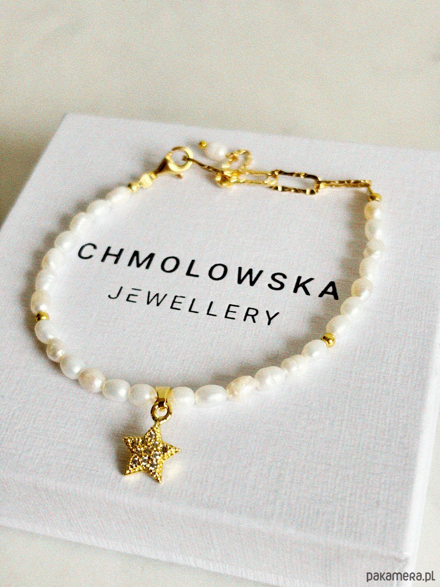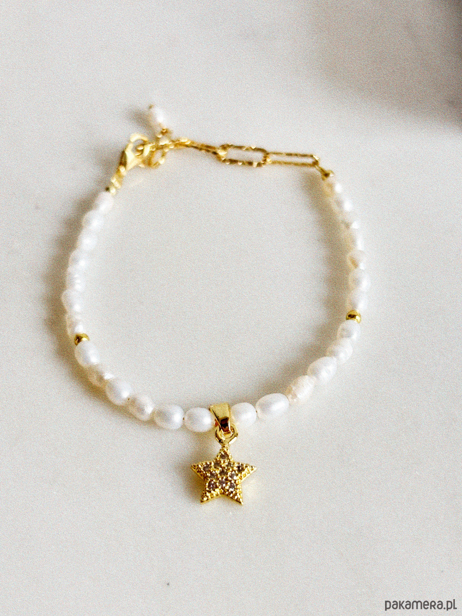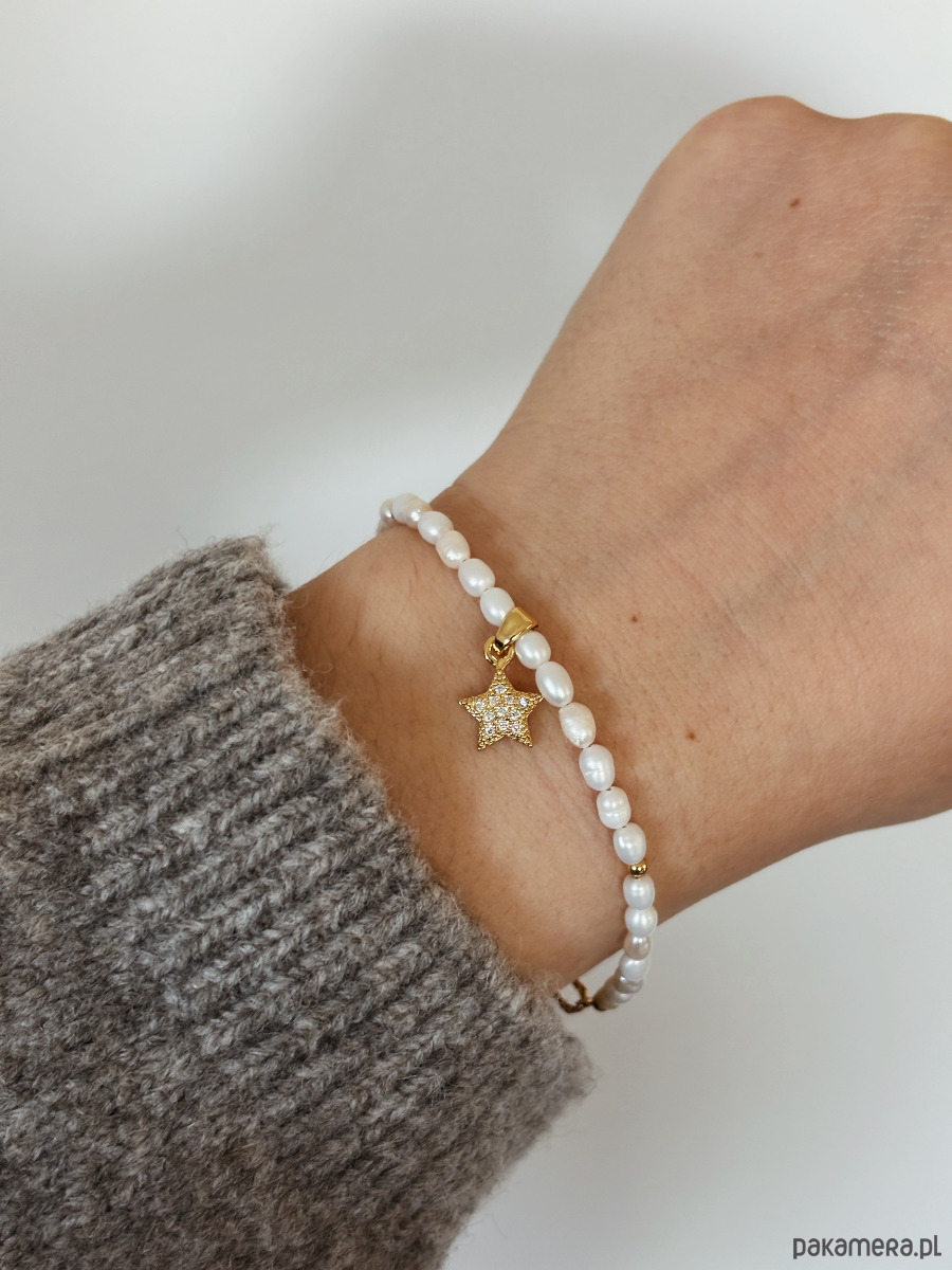 Bransoletka wykonana jest z pereł naturalnych, zapięcia I łańcuszka ze stali ch.