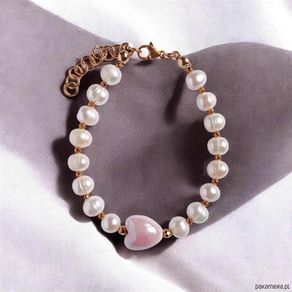 Bransoletka na solidnej lince stalowej (miękkiej) - została wykonana z naturalnych, lekko nieregularnych pereł słodkowodnych(ok. 7mm) ,przekładek ze złotego hematytu oraz ceramicznego serduszka (ok. 13mm).