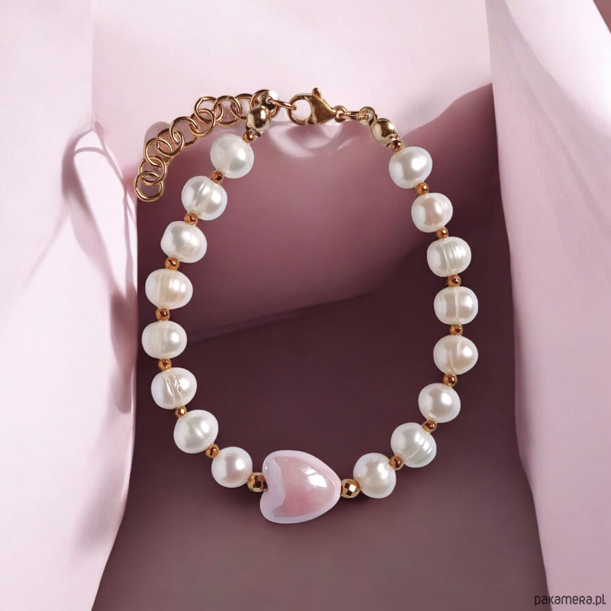 Bransoletka : PERŁY naturalne i ceramiczne serduszko : pastelowe różowe