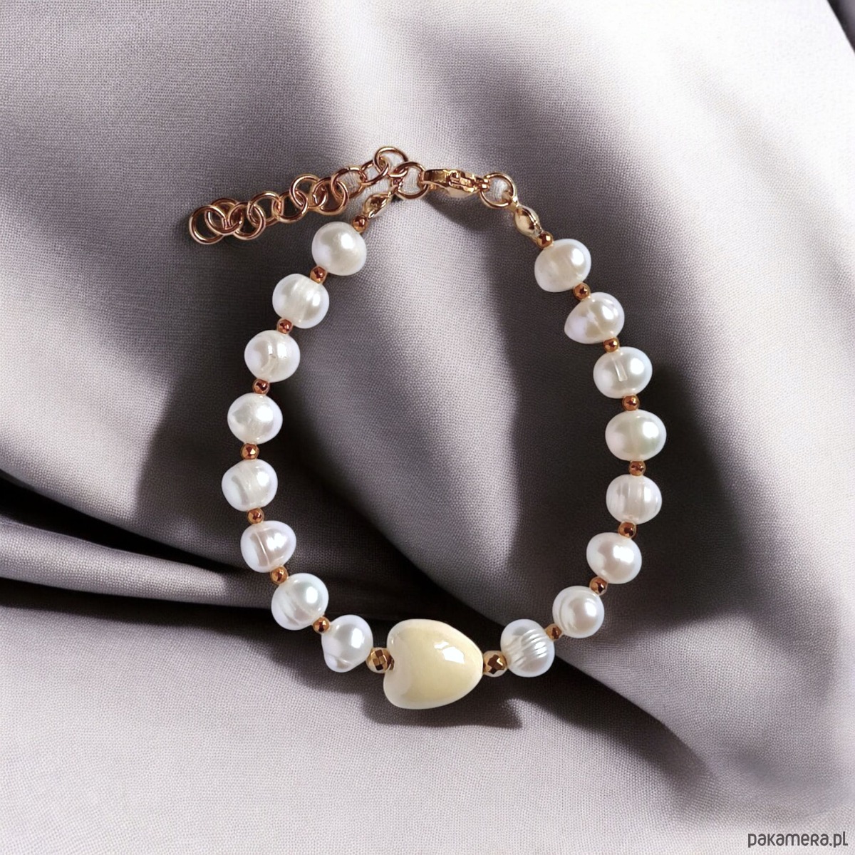 Bransoletka na solidnej lince stalowej (miękkiej) - została wykonana z naturalnych, lekko nieregularnych pereł słodkowodnych(ok. 7mm) ,przekładek ze złotego hematytu oraz ceramicznego serduszka (ok. 13mm).