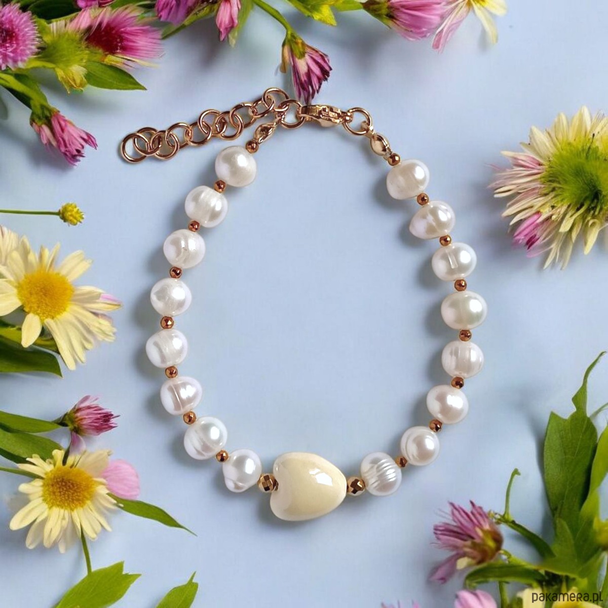 Bransoletka na solidnej lince stalowej (miękkiej) - została wykonana z naturalnych, lekko nieregularnych pereł słodkowodnych(ok. 7mm) ,przekładek ze złotego hematytu oraz ceramicznego serduszka (ok. 13mm).