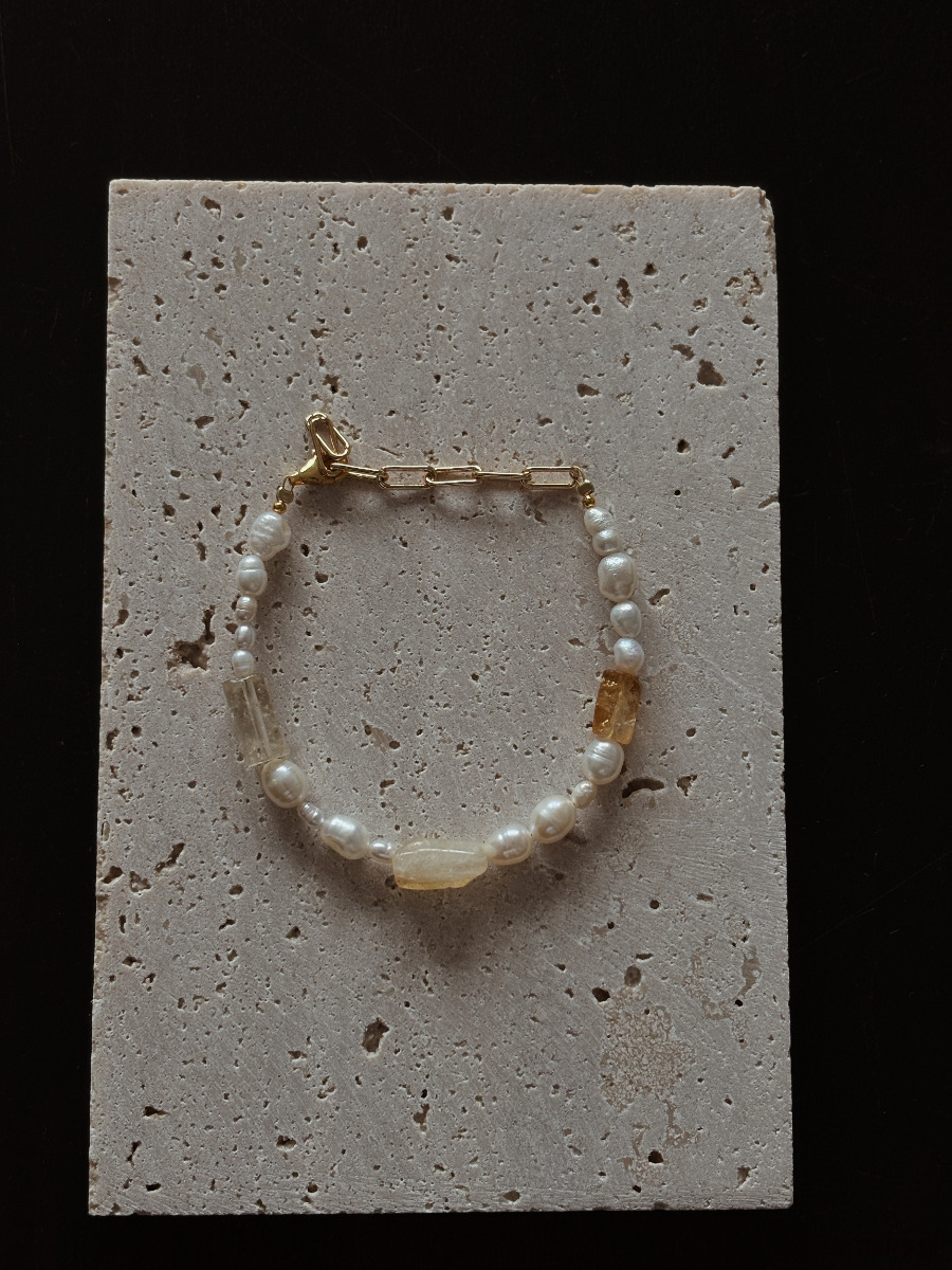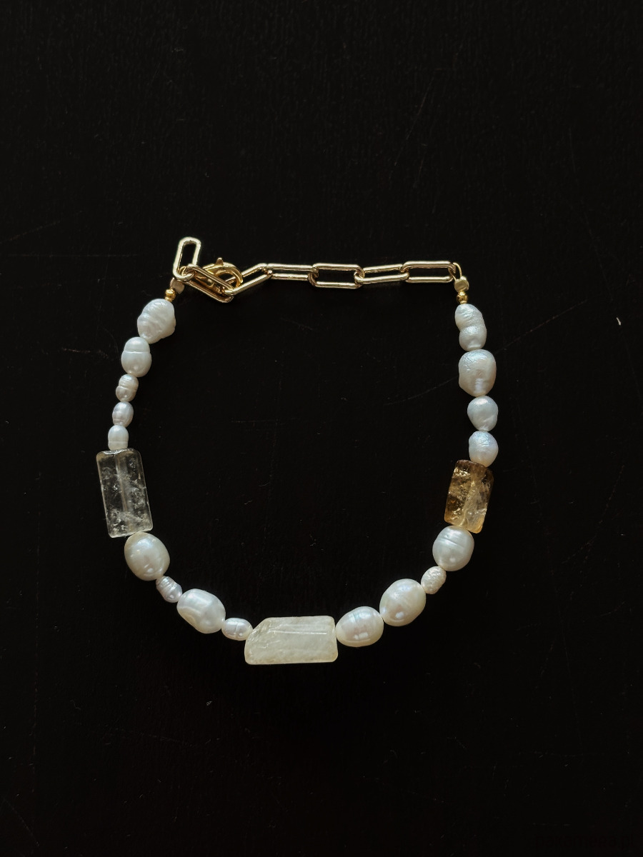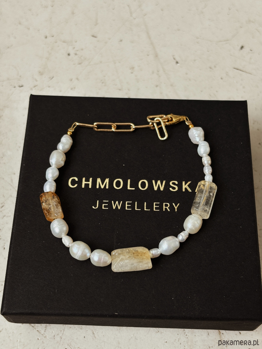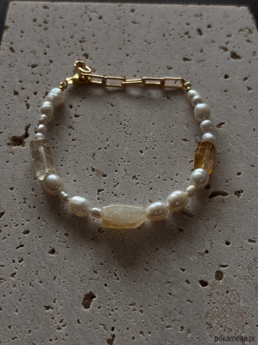 Bransoletka wykonana jest z pereł naturalnych,cytrynu, zapięcia I łańcuszka rodowanych złotem.