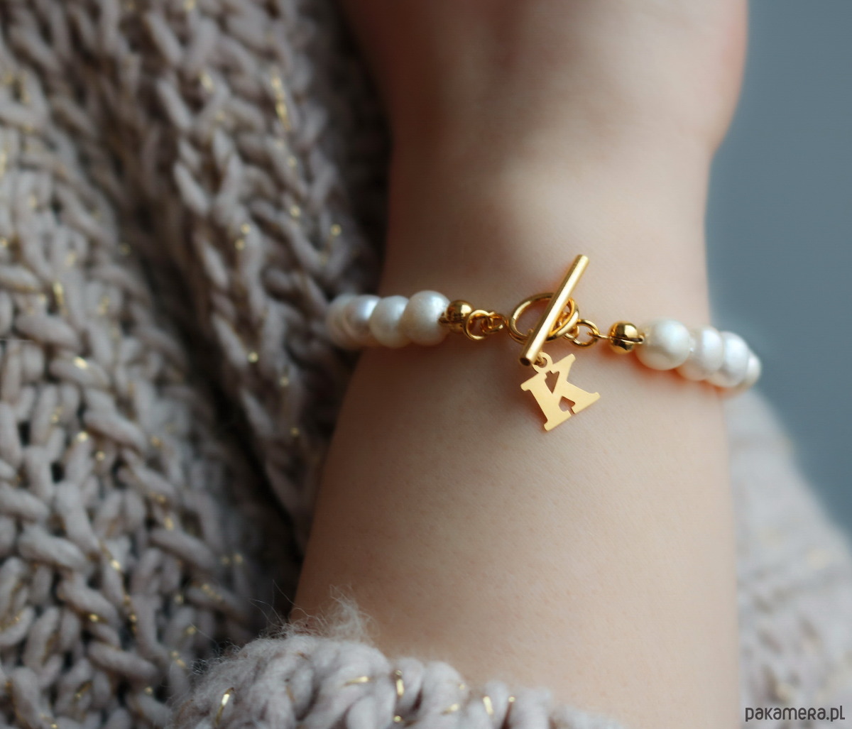 Bransoletka perły naturalne z literką srebro 925 pozłacane