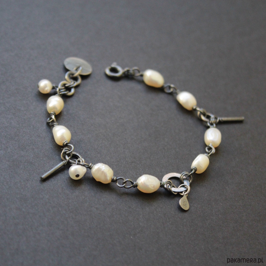 Bransoletka została wykonana z mocno oksydowanego srebra próby 925 oraz pereł hodowlanych o wielkości 0,5-0,7 cm.