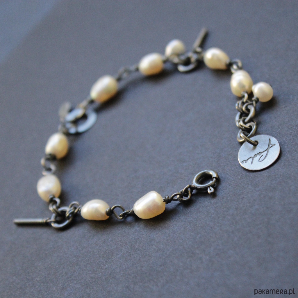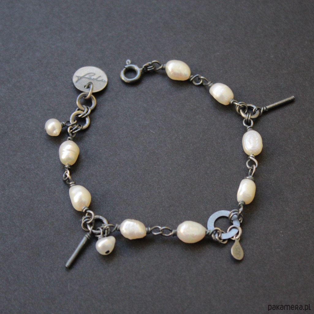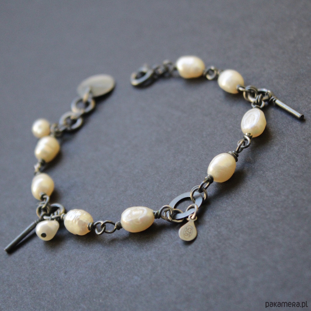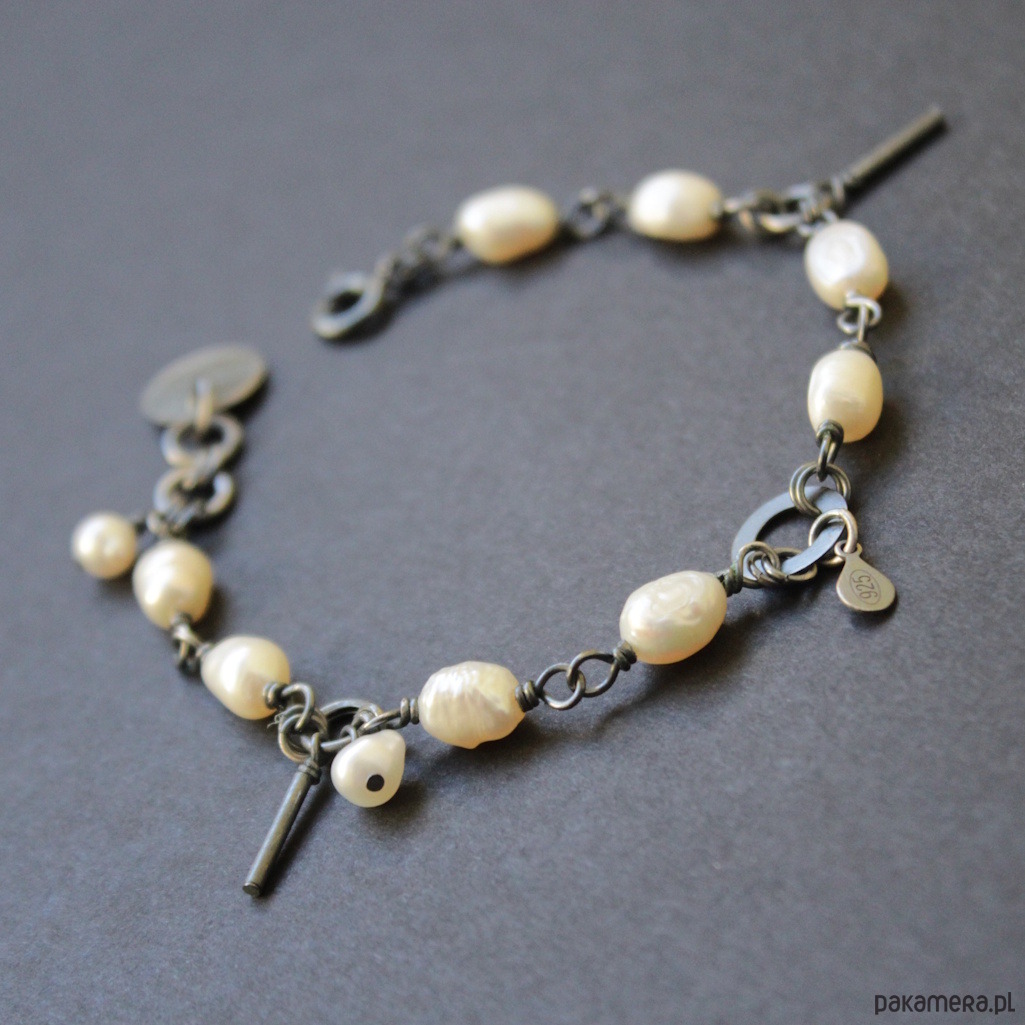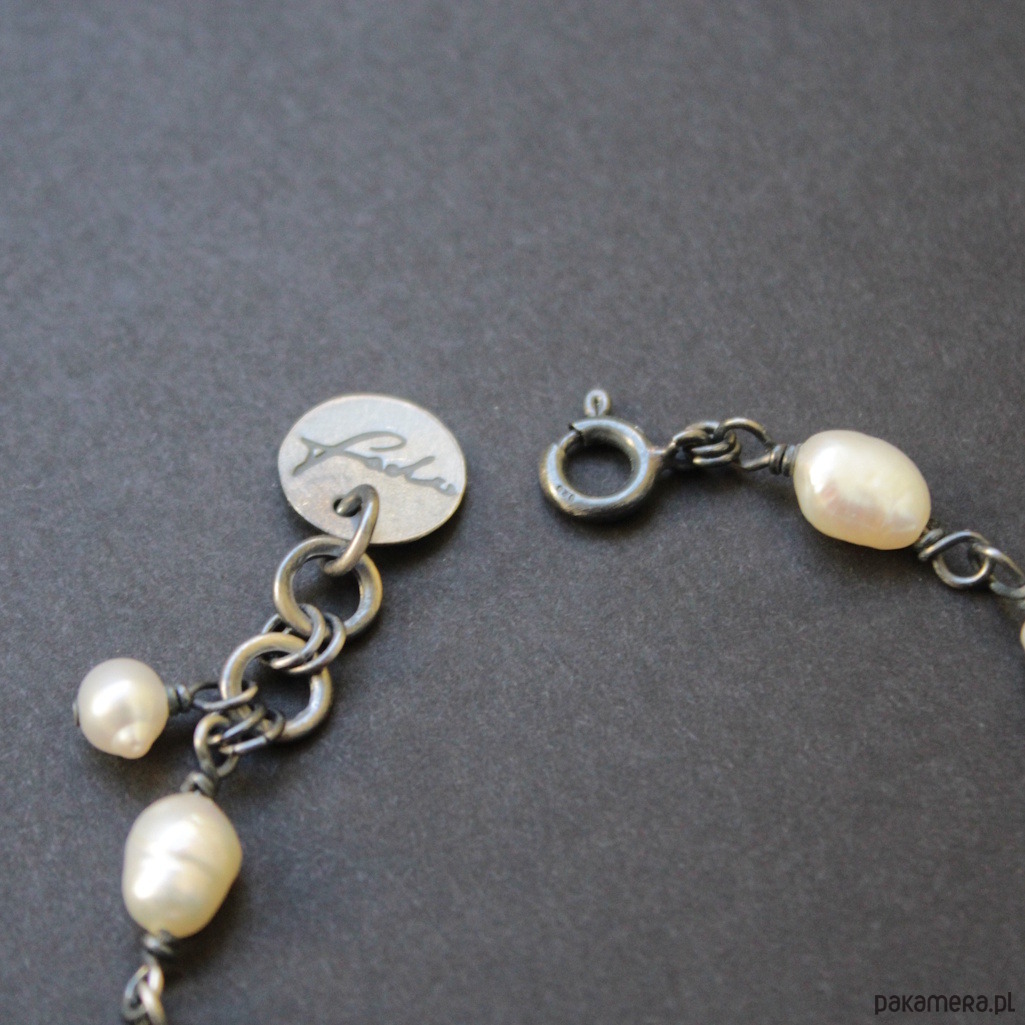 Bransoletka została wykonana z mocno oksydowanego srebra próby 925 oraz pereł hodowlanych o wielkości 0,5-0,7 cm.