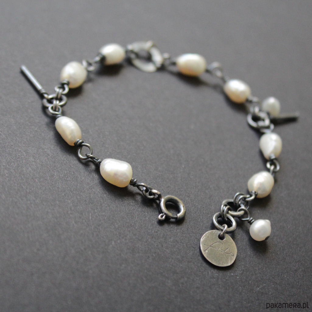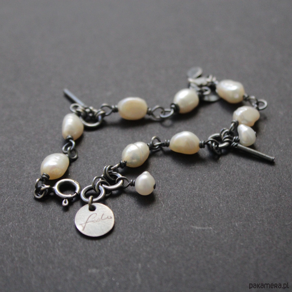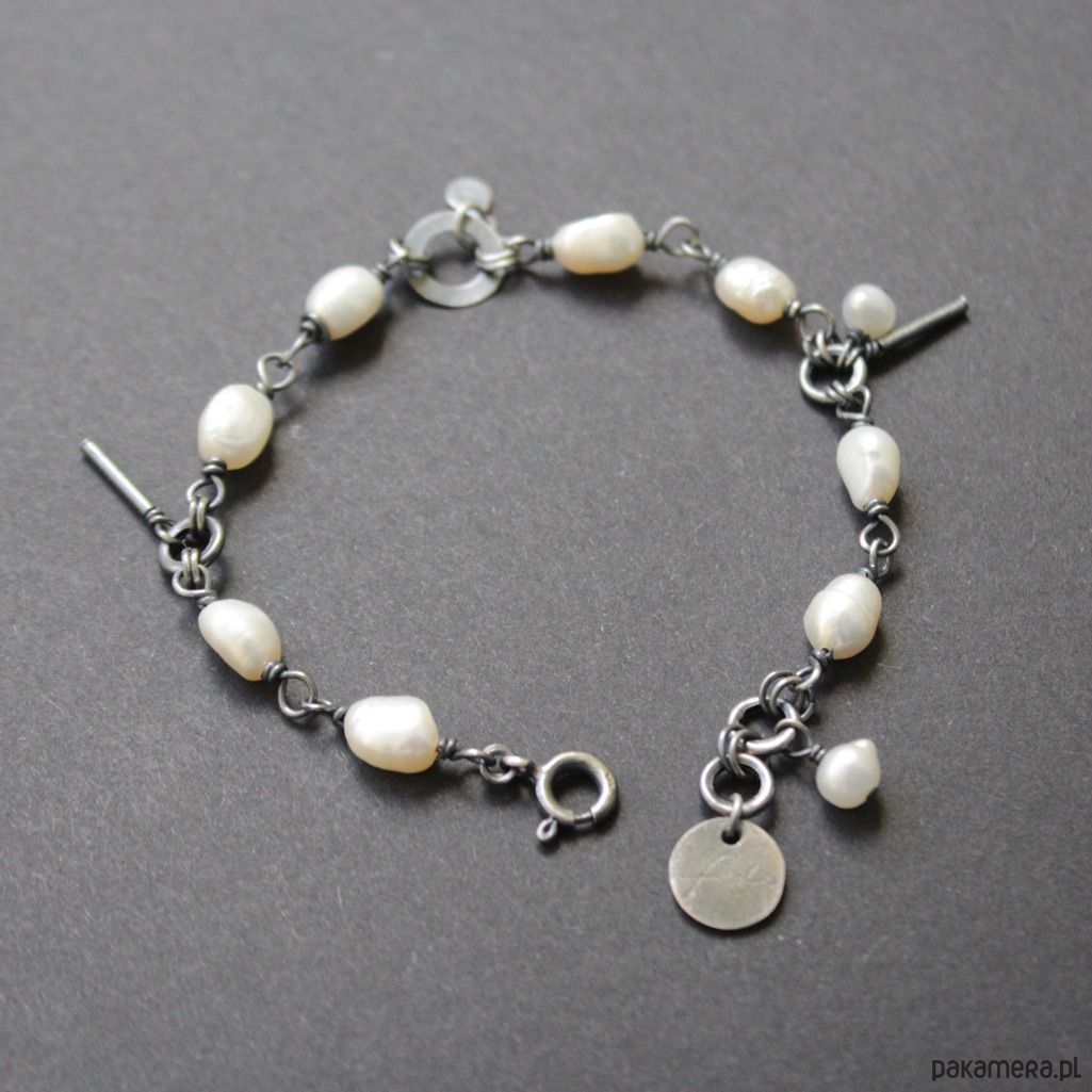 Bransoletka została wykonana z mocno oksydowanego srebra próby 925 oraz pereł hodowlanych o wielkości 0,5-0,7 cm.