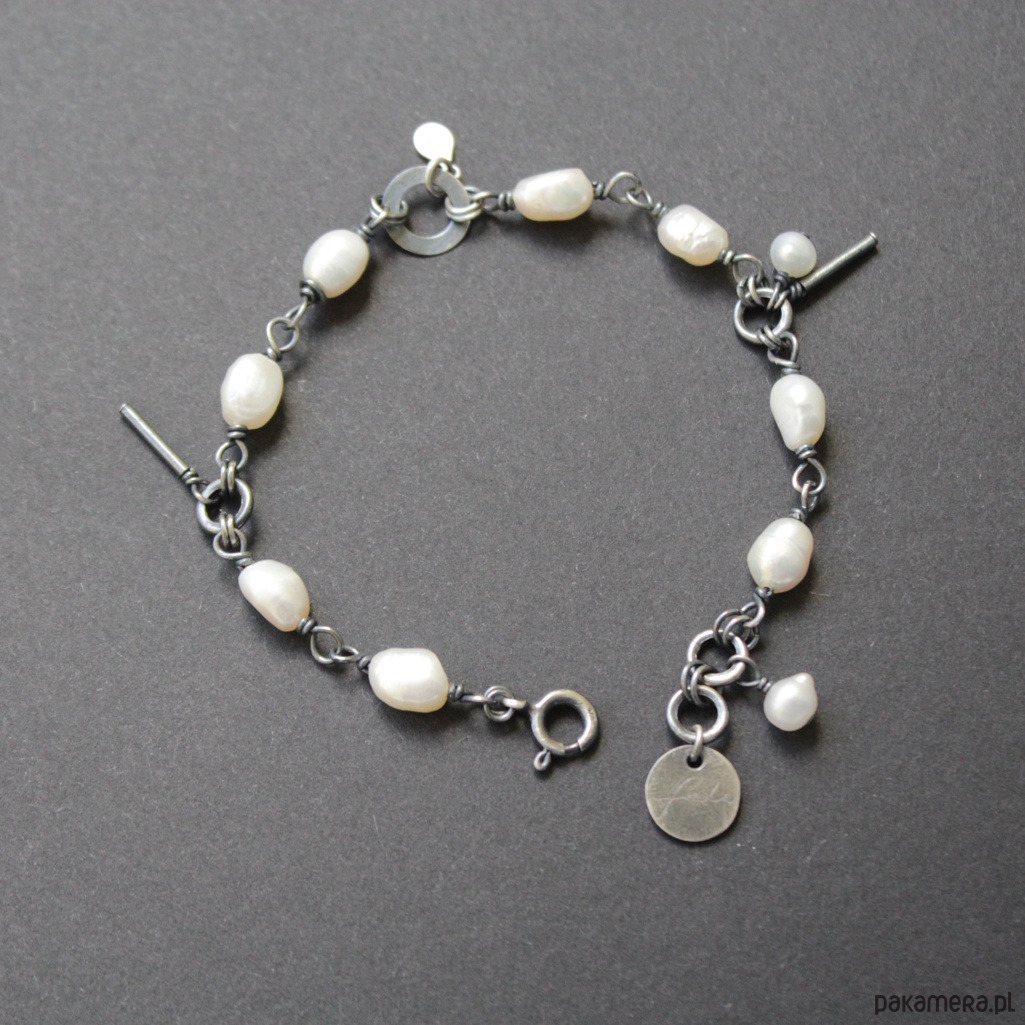 Bransoletka została wykonana z mocno oksydowanego srebra próby 925 oraz pereł hodowlanych o wielkości 0,5-0,7 cm.
