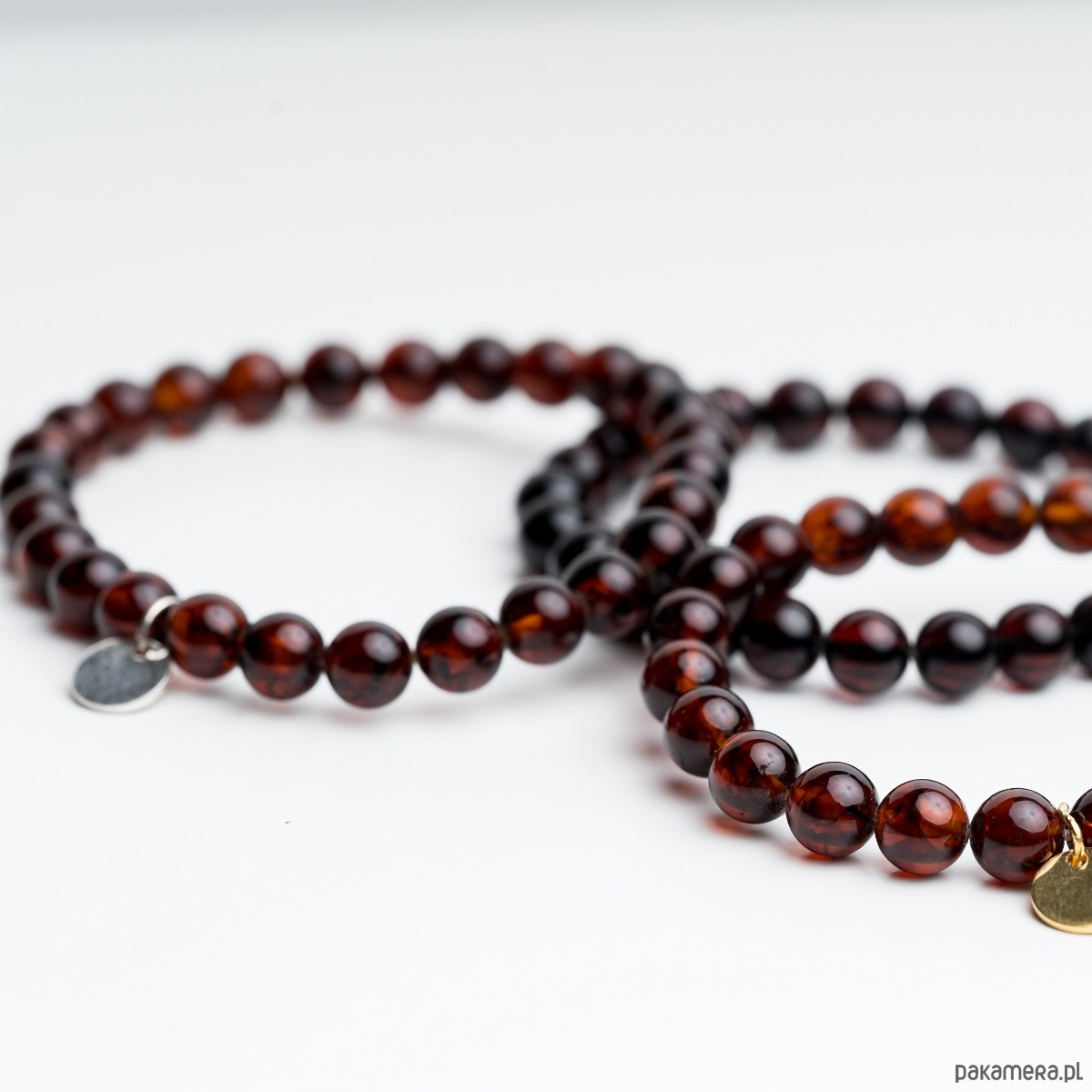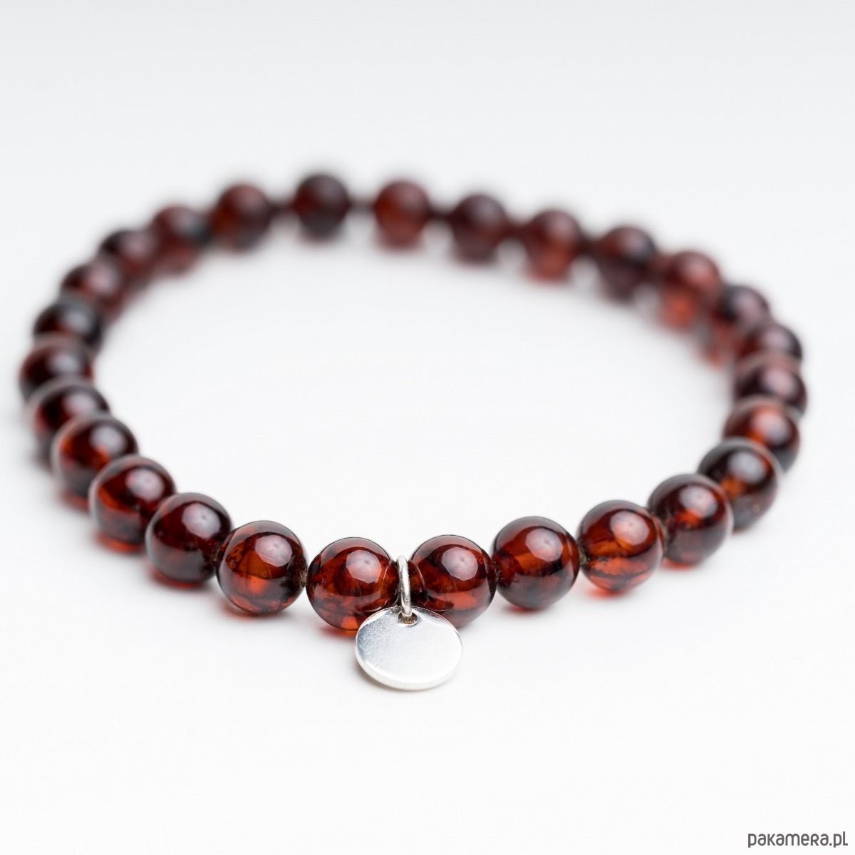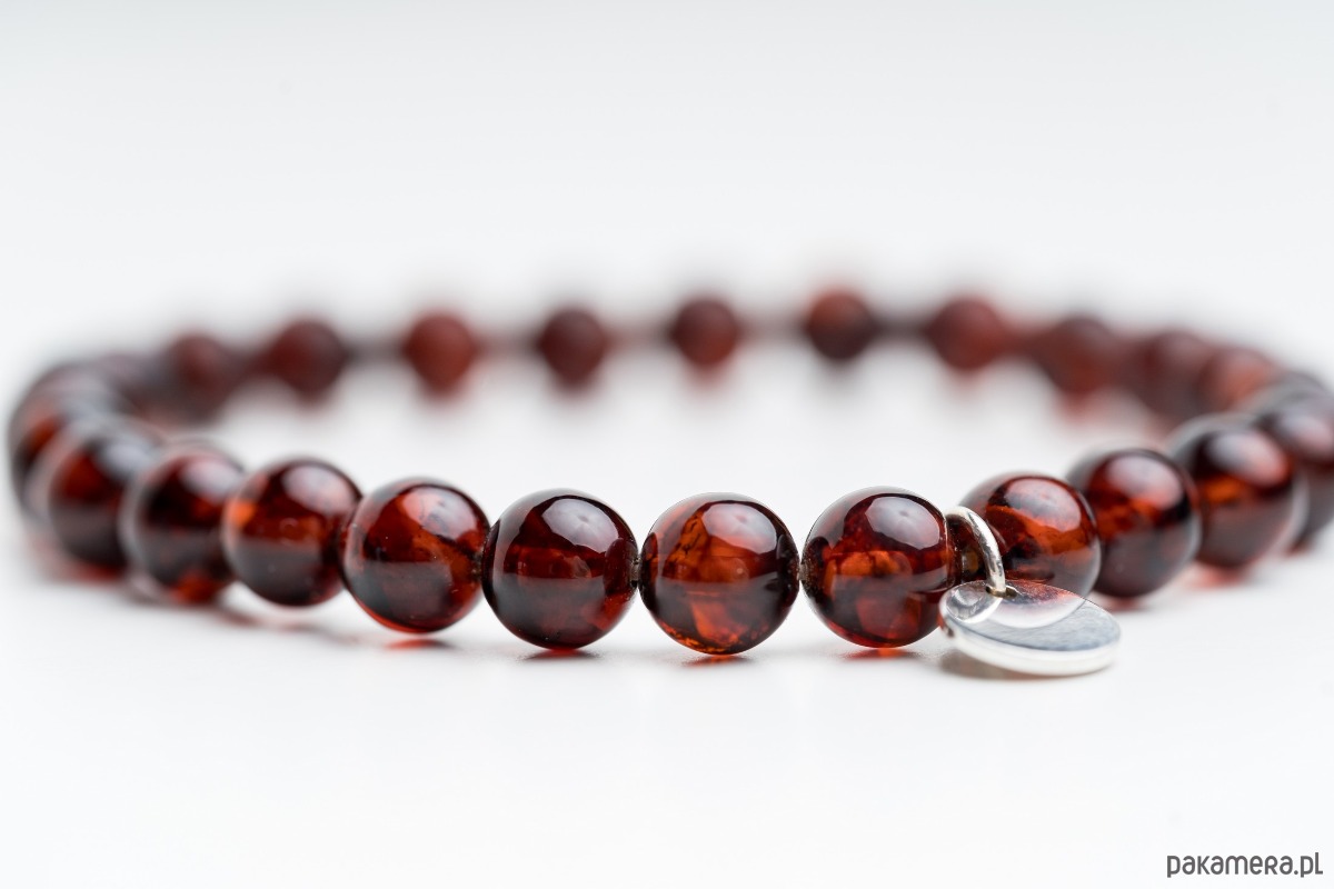 Elegancka bransoletka wykonana z naturalnego bursztynu bałtyckiego o regularnym kształcie kulki 8 mm. iemny wiśniowy odcień bursztynu pięknie mieni się w świetle, podkreślając naturalne inkluzje i wyjątkowy charakter każdego koralika.