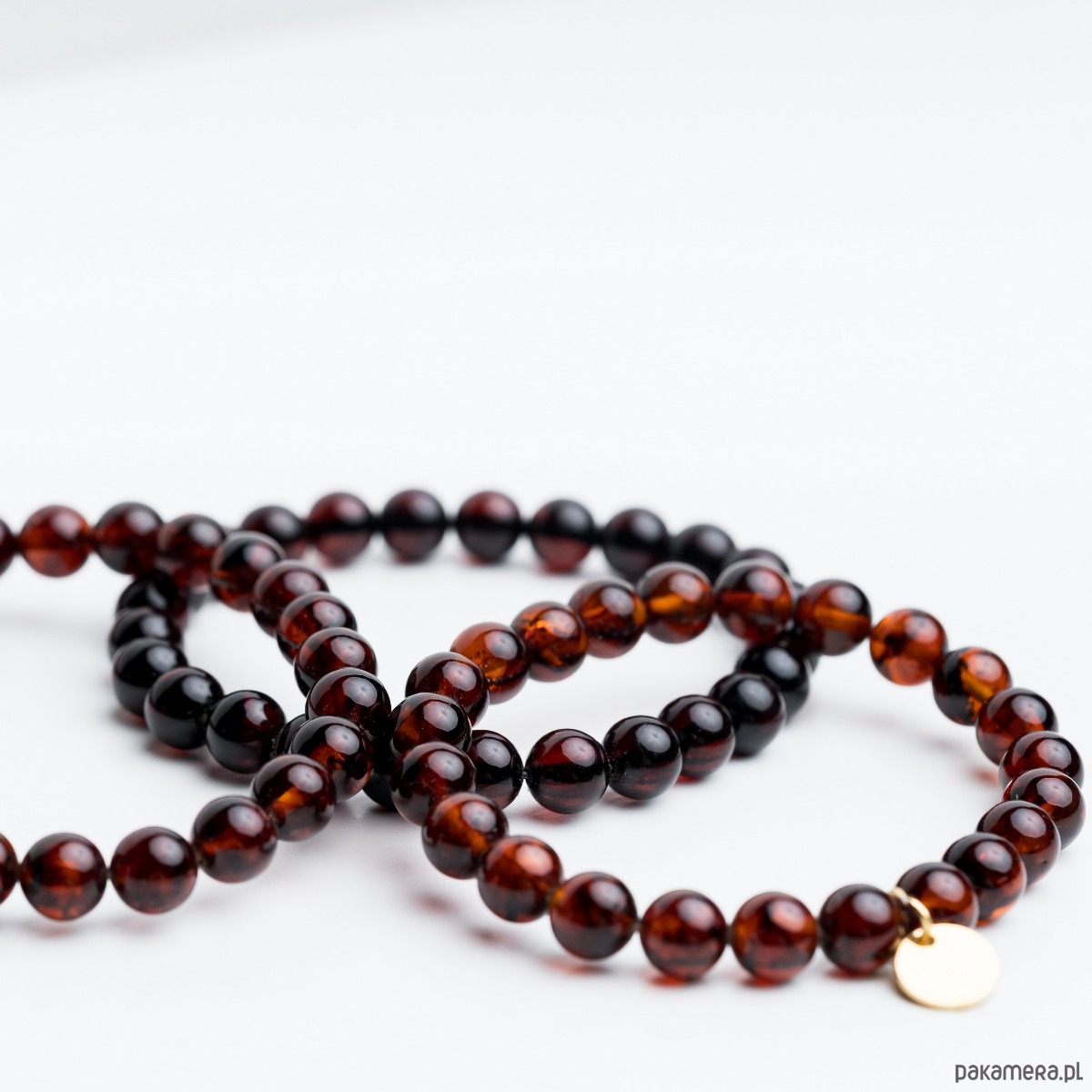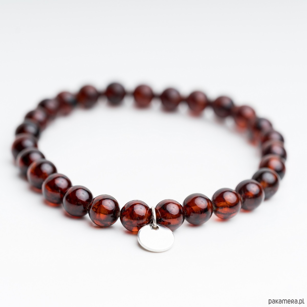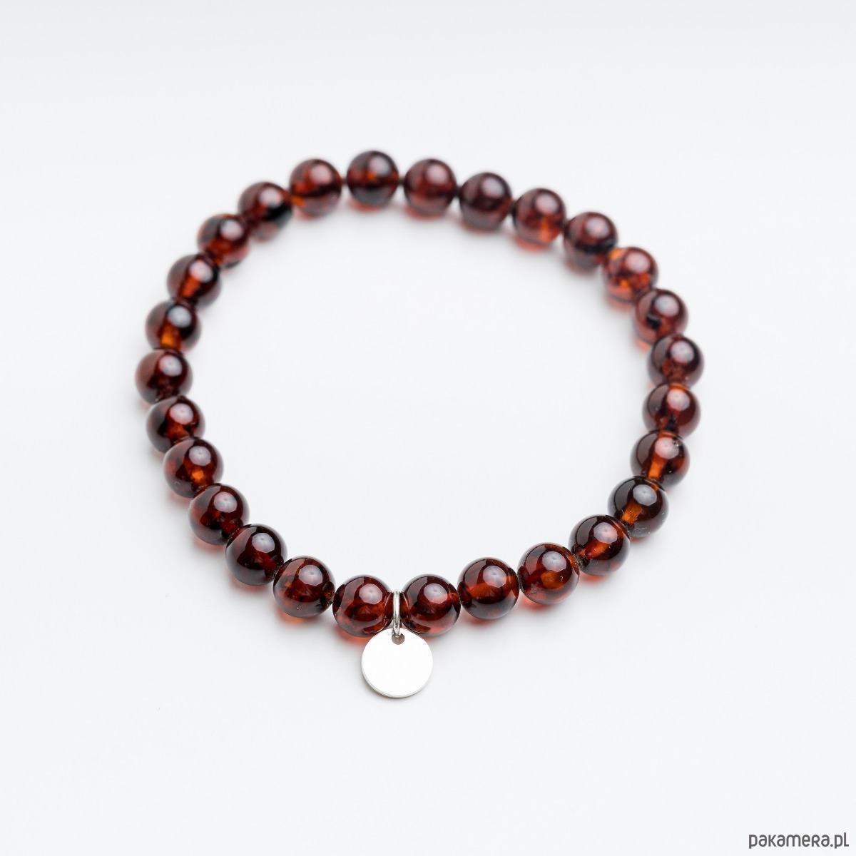 Elegancka bransoletka wykonana z naturalnego bursztynu bałtyckiego o regularnym kształcie kulki 8 mm. iemny wiśniowy odcień bursztynu pięknie mieni się w świetle, podkreślając naturalne inkluzje i wyjątkowy charakter każdego koralika.