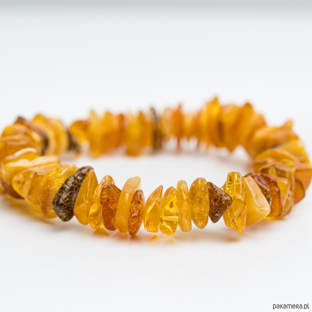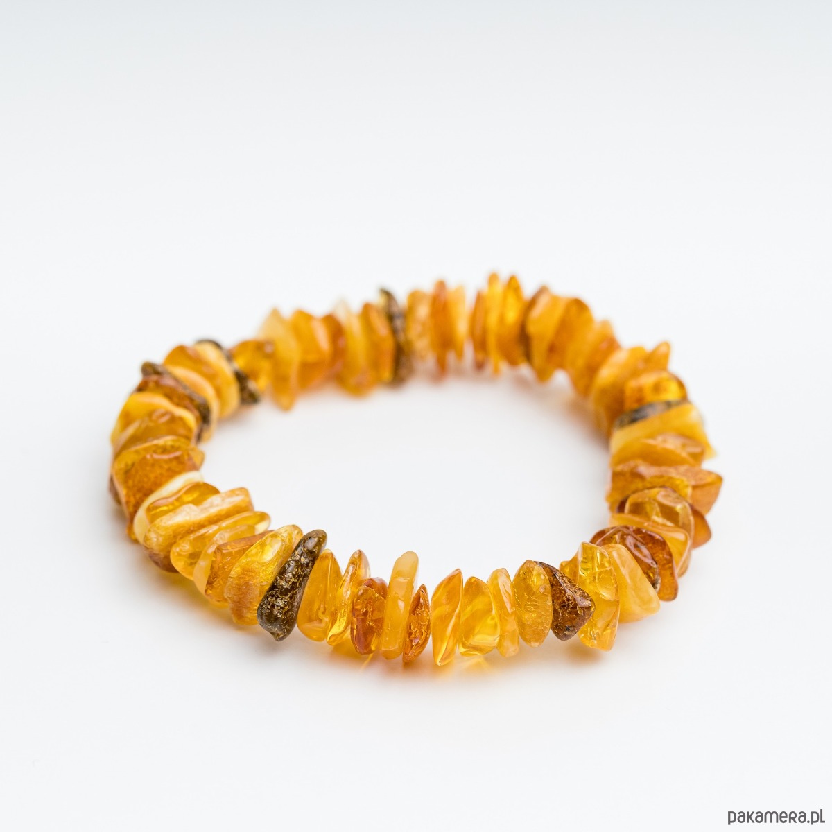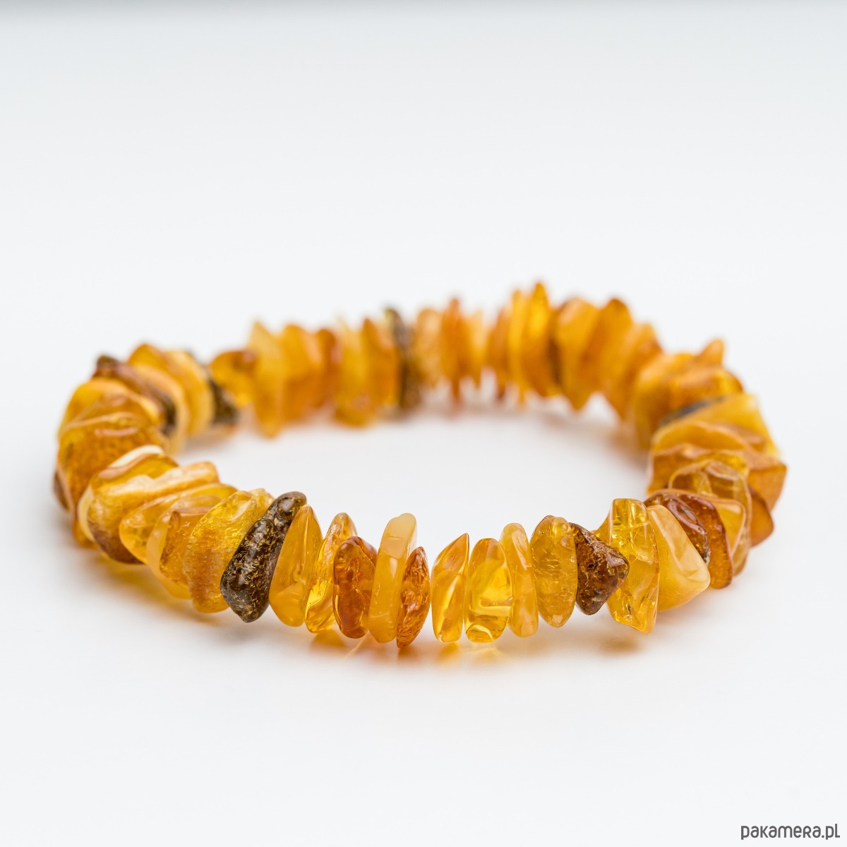 Ta ręcznie wykonana bransoletka stworzona została z naturalnych, nieregularnych koralików bursztynu bałtyckiego w ciepłych odcieniach koniaku i miodu. Polerowane koraliki zostały nawleczone na wytrzymałą gumkę, która dopasowuje się do każdego nadgarstka. Eleganckie połączenie wygody i naturalnej elegancji bursztynu!