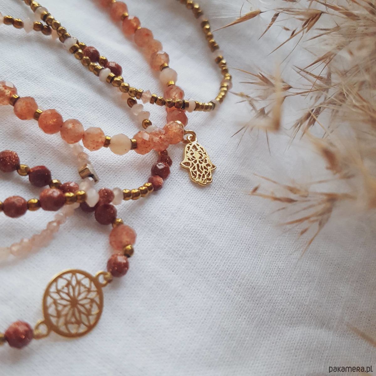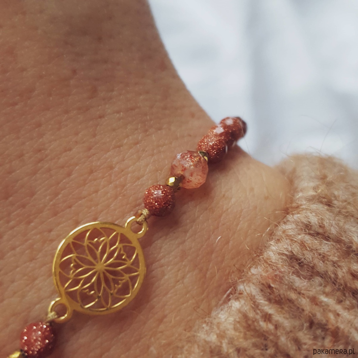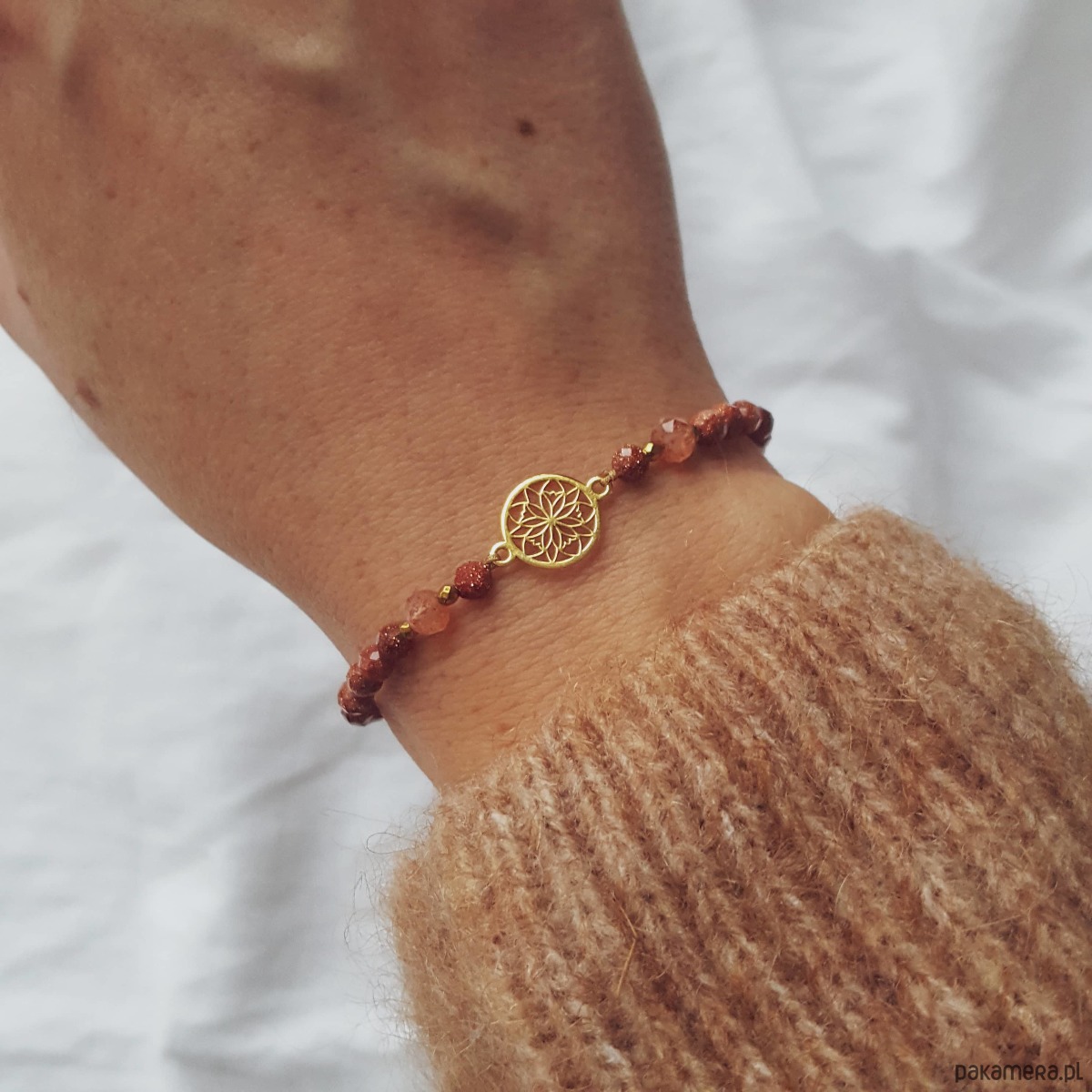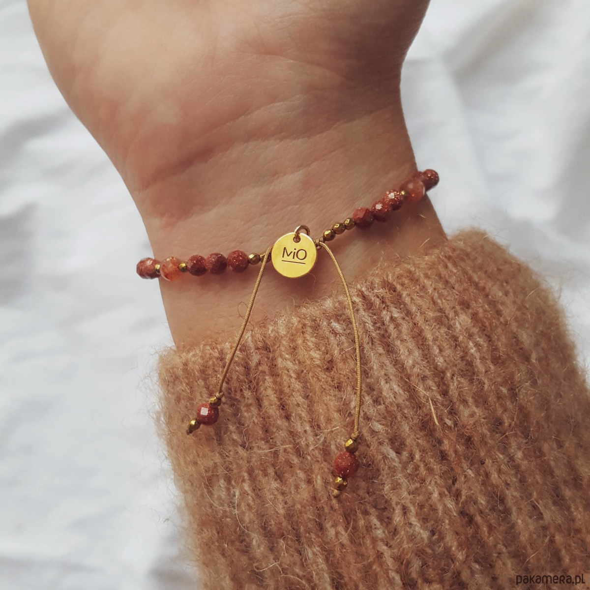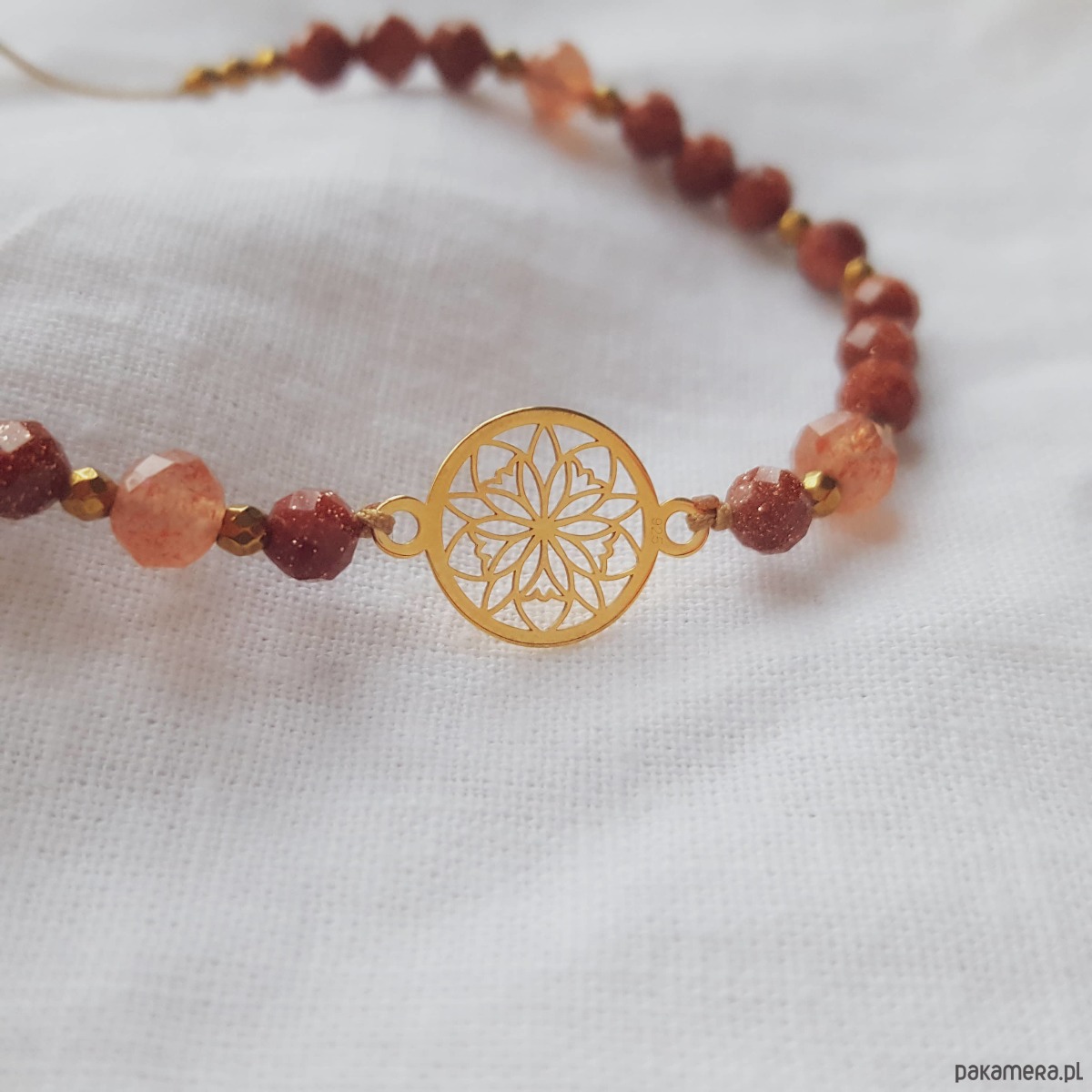 Bransoletka z piasku pustyni oraz kamieni słonecznych i złotych hematytów na beżowym sznurku jubilerskim. Bransoletka łączy ciepłe kolory złota, beżu, brzoskwini i rudości. W centralnej części umieściliśmy ażurową rozetę wykonaną ze srebra pozłacanego. Po bokach wplecione są iskrzące kamienie piasku pustyni oraz kamienie słoneczne, przełożone drobnymi złotymi hematytami. Piasek pustyni ma zatopione wewnątrz opiłki metali, dzięki czemu cudownie błyszczy tysiącami złotych drobin. Bransoletka ma regulowaną wielkość, więc będzie pasować na każdy rozmiar nadgarstka. Zapięcie to pleciona makrama, którą przyozdabia okrągła blaszką z logo MiO (srebro 925).