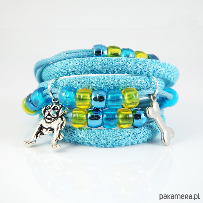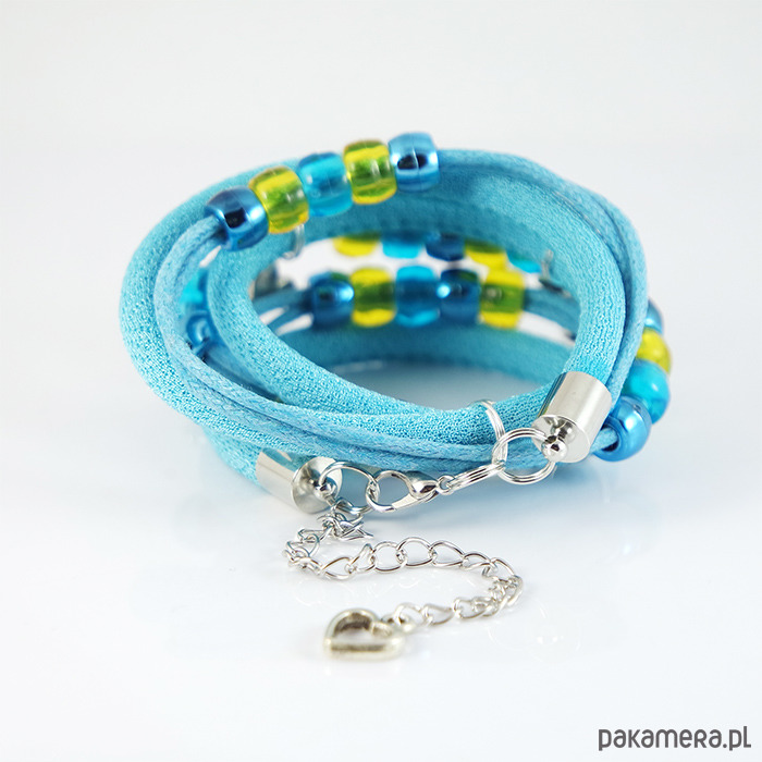 Bransoletka wykonana jest z rzemienia szytego z materiału, sznureczków oraz koralików akrylowych.