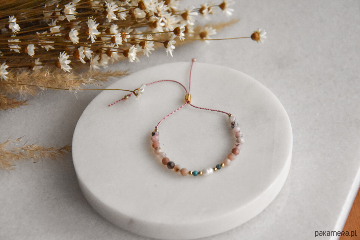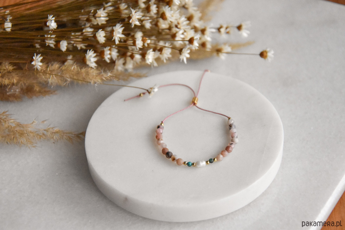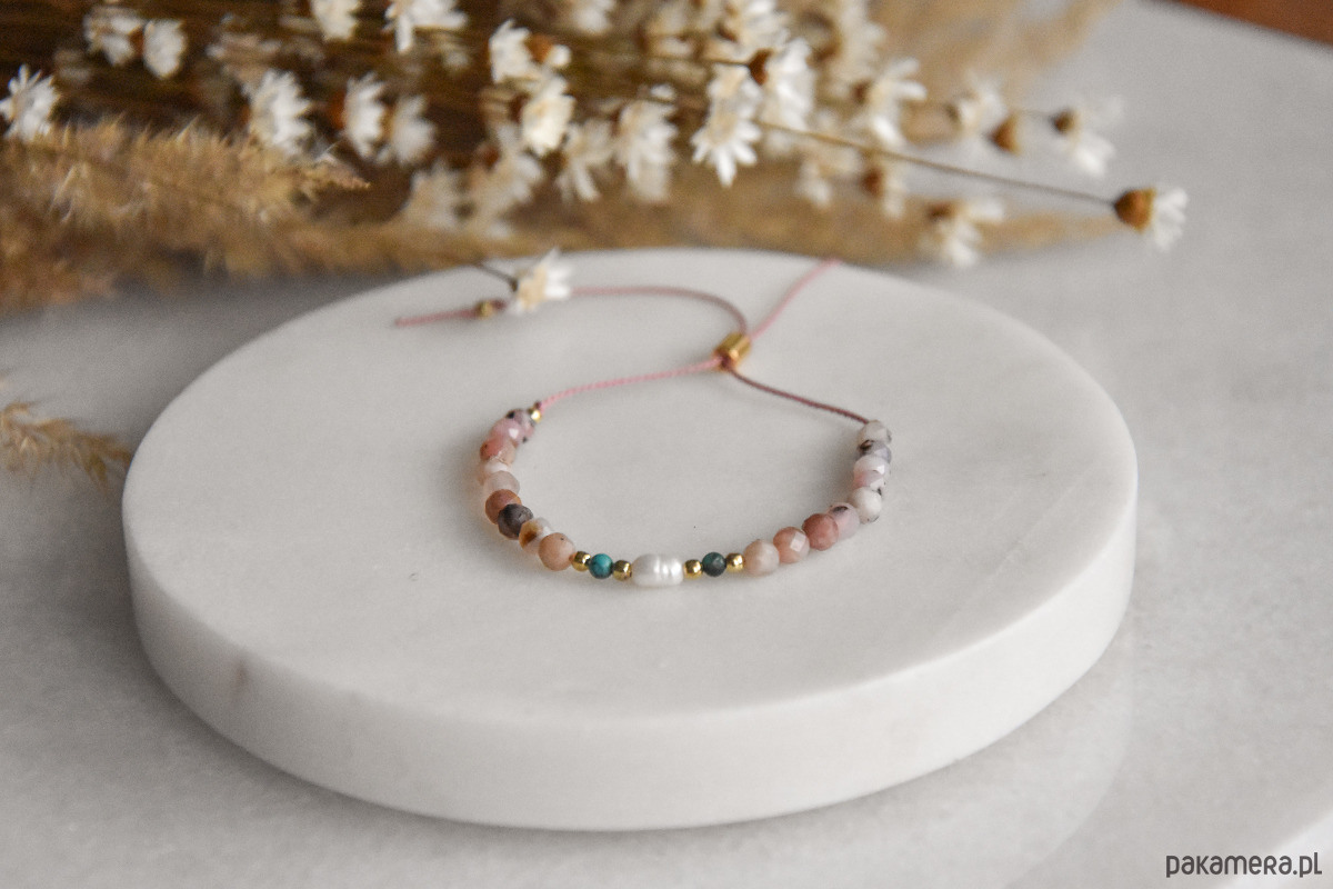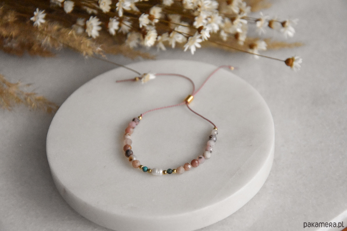 Bransoletka Pink Bella na nici jedwabnej z perełką, opalem i turkusem