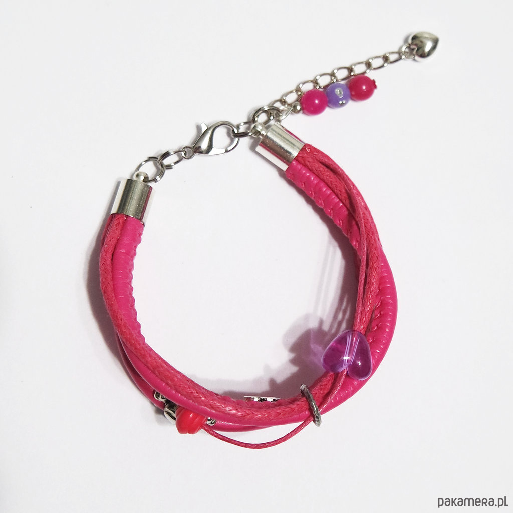 Bransoletka zrobiona jest z rzemieni z eko-skóry, sznurka oraz przekładek.