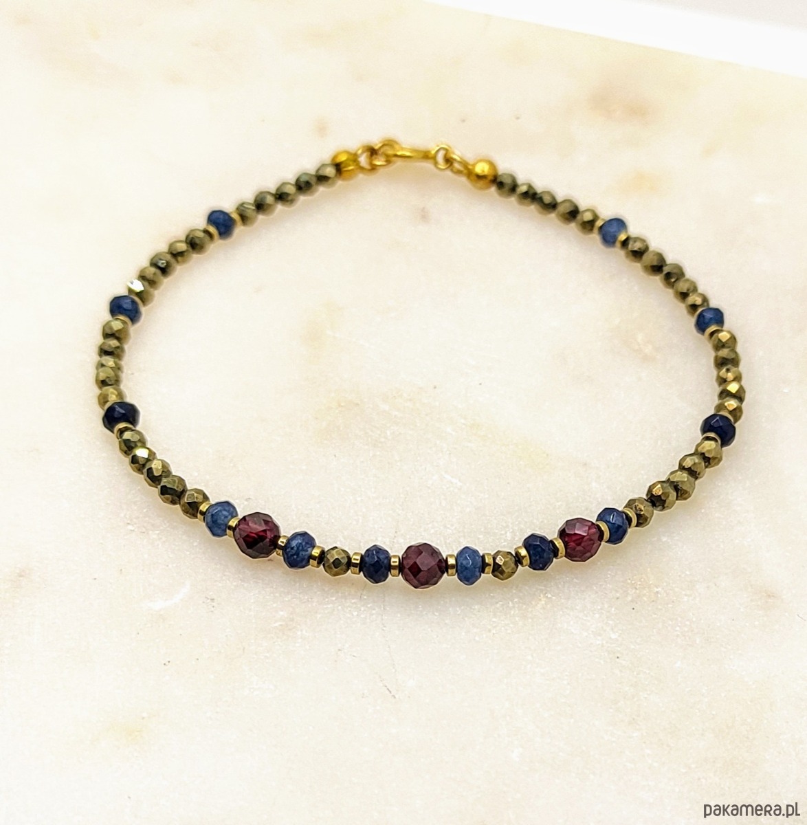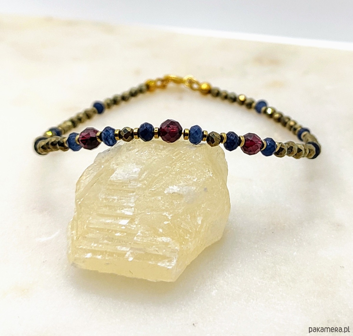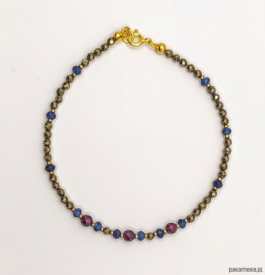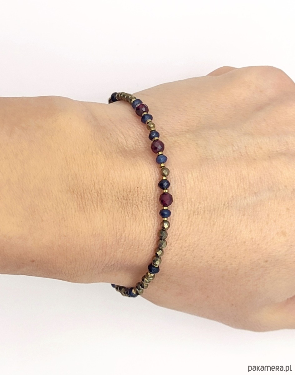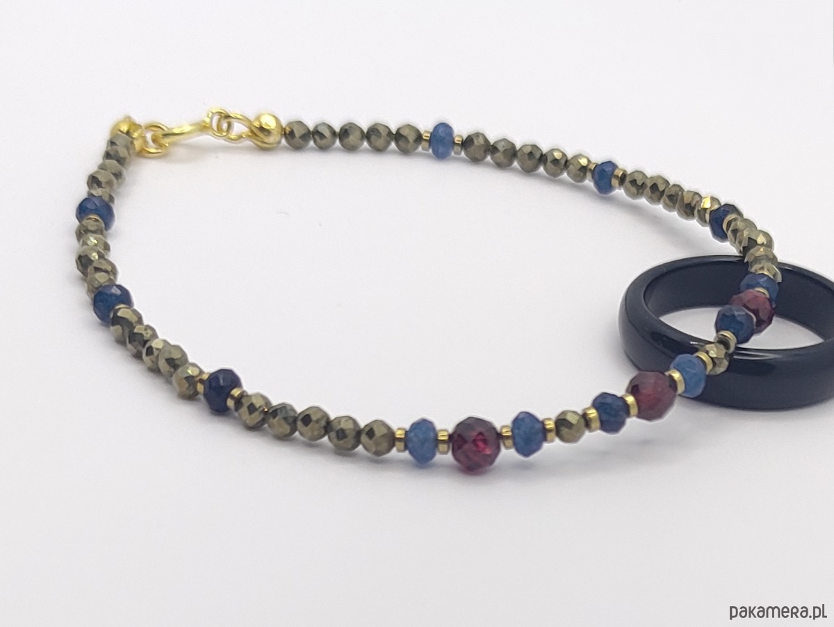 Bransoletka z pozłacanego srebrna wykonana z fasetowanych pirytów. Złocisty blask pirytu pięknie komponuje się z granatami i szafirowym jadeitem. Kamienie zostały przełożone pozłacanym hematytem. Delikatna, w intensywnym kolorze. Otrzymasz z łańcuszkiem z pozłacanego srebra do regulacji rozmiaru.