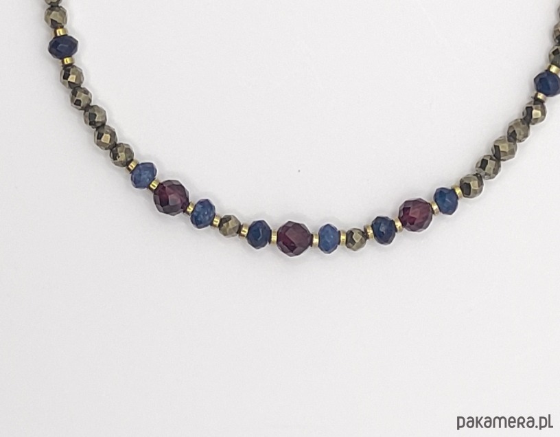 Piryt - naturalny kamień, fasetowane kuleczki, średnica 3 mm, Granat - naturalny kamień, fasetowane kuleczki, wysoka jakość o pięknej przejrzystości, średnica 4 mm