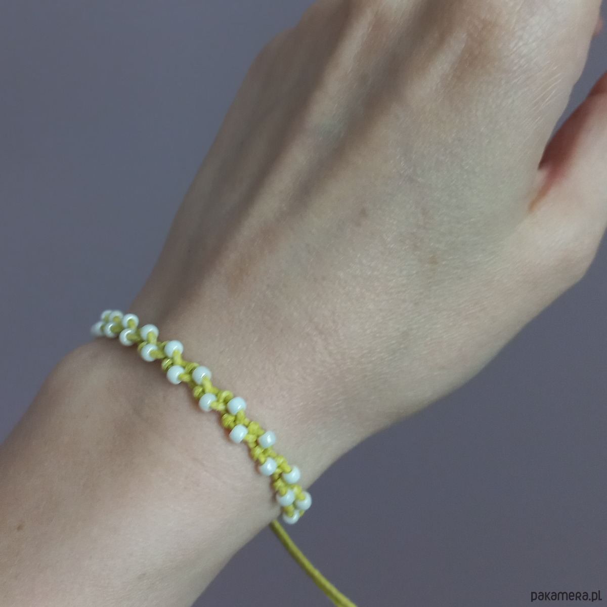 Bransoletka pleciona ręcznie z użyciem bawełnianego sznurka i wysokiej jakości szklanych koralików. Regulację bransoletki stanowią odpowiednio zaplecione końcówki rzemyka. Na drugim zdjęciu w zestawieniu z bransoletką plecioną z oponką.