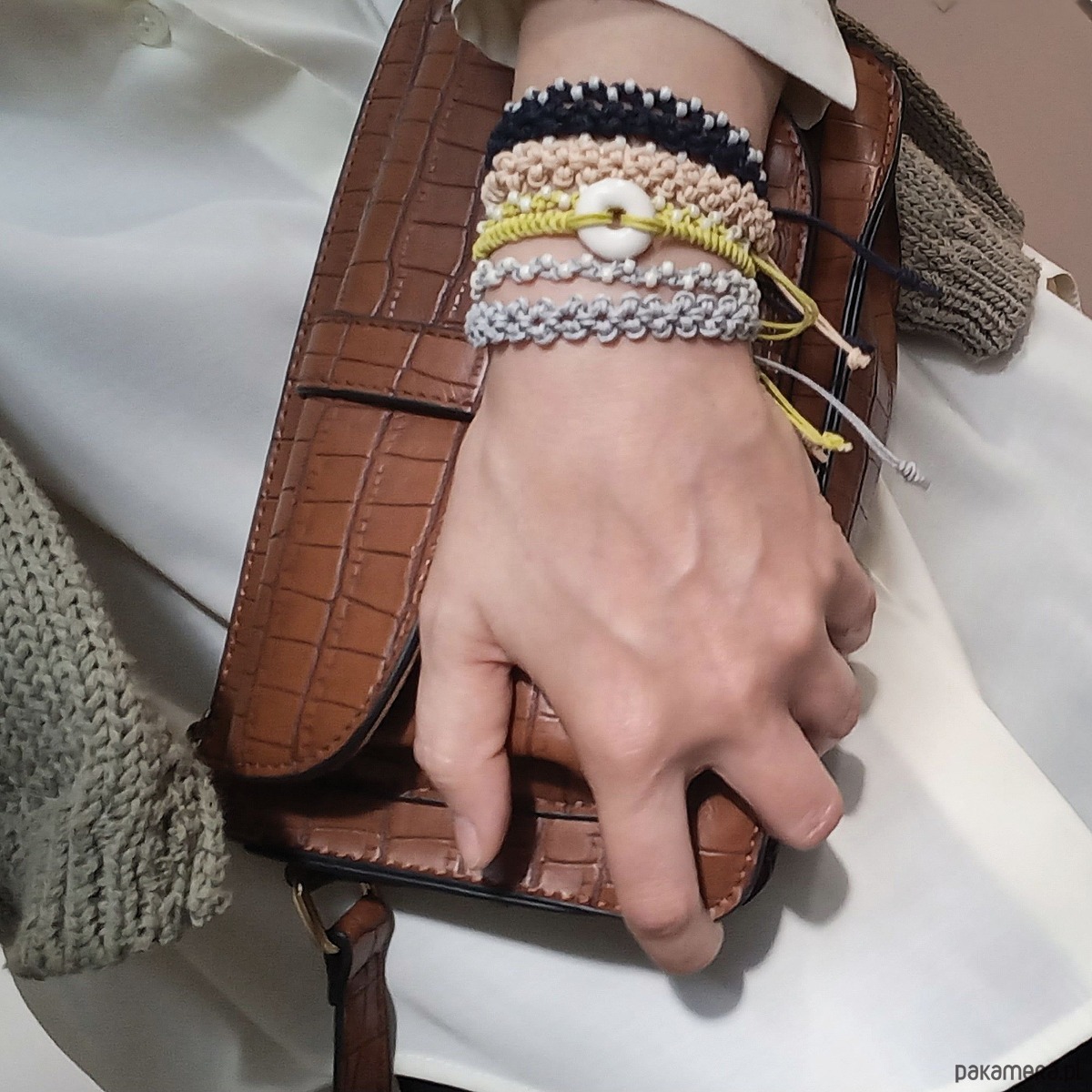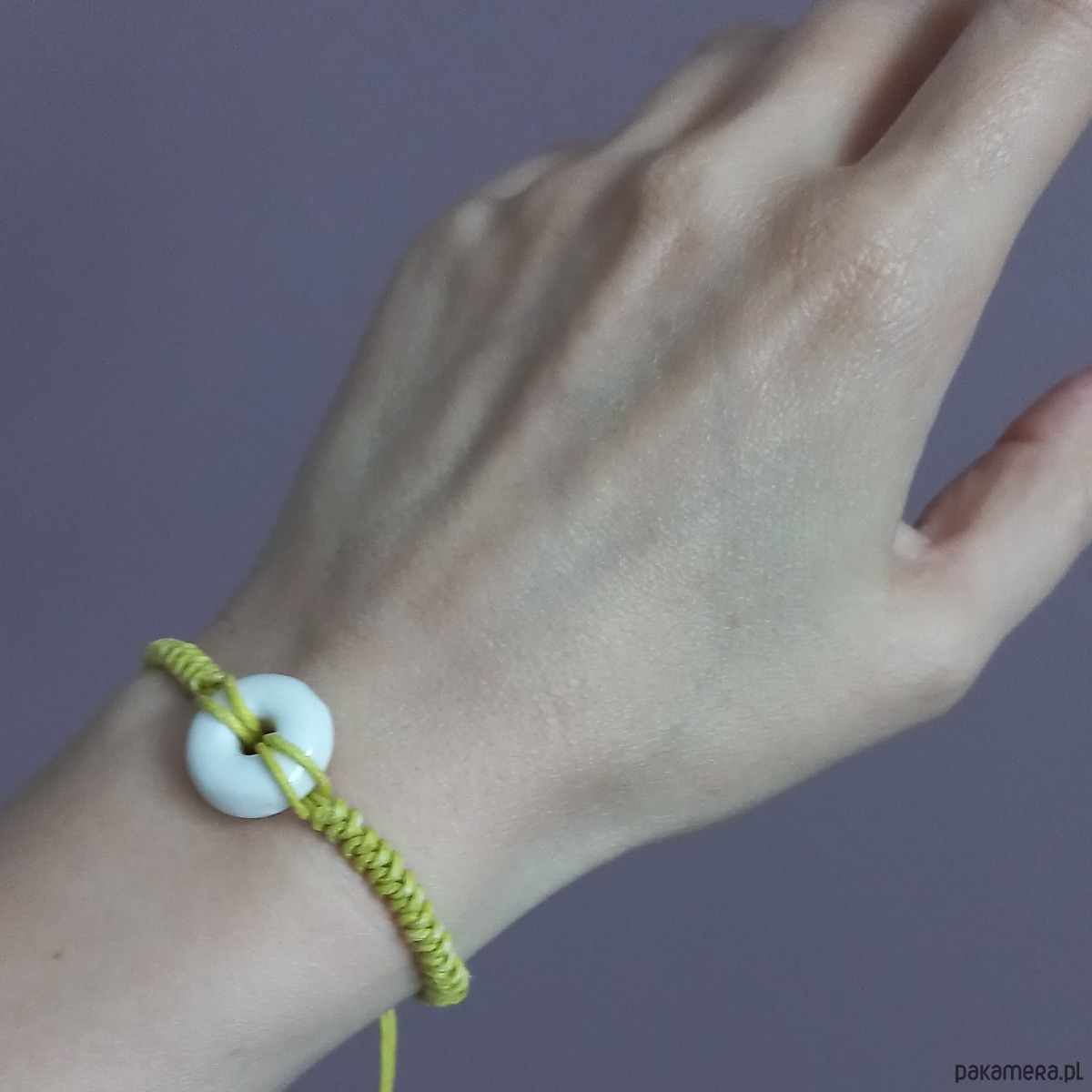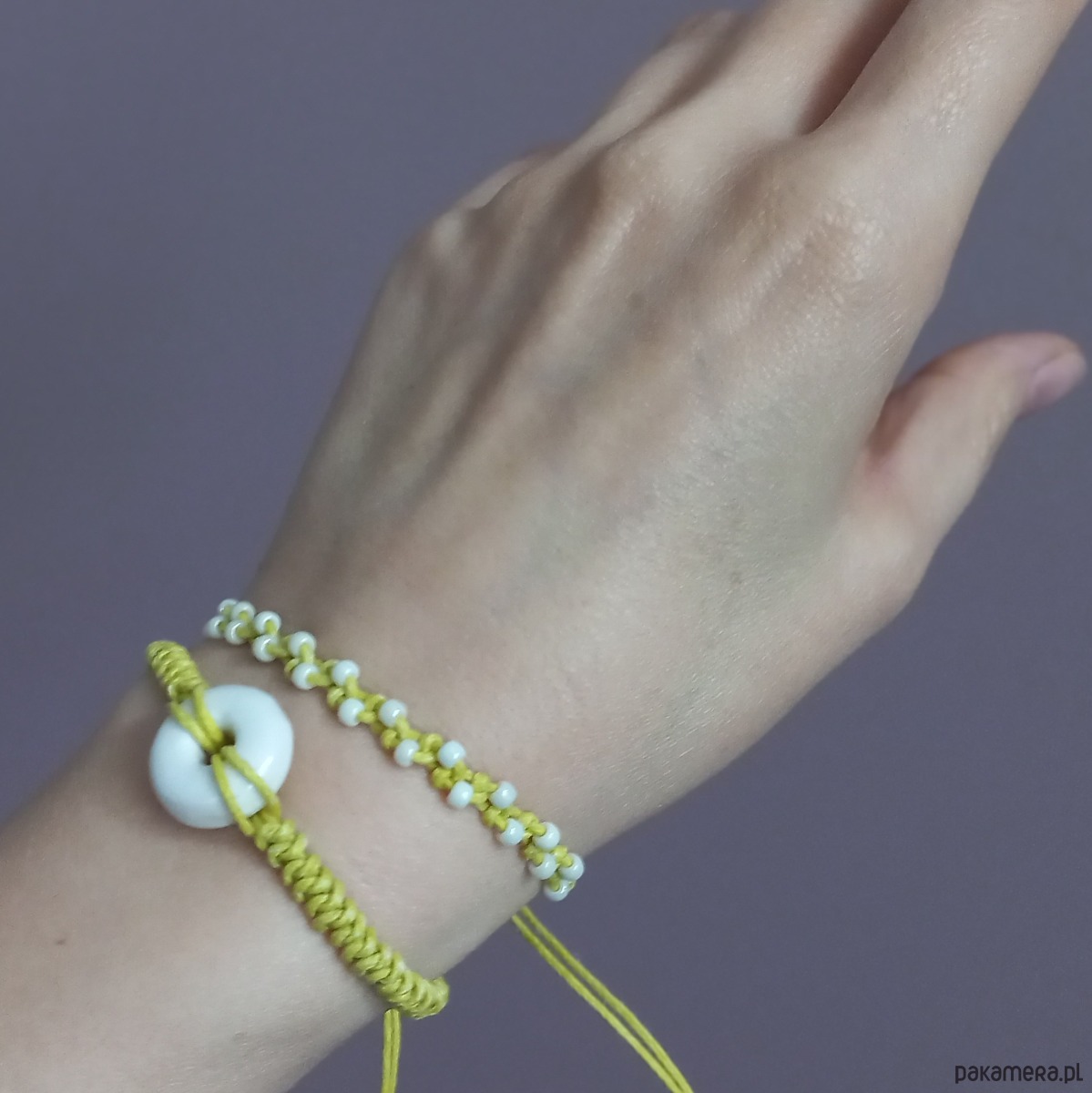 Bransoletka pleciona ręcznie z użyciem bawełnianego sznurka i wysokiej jakości szklanych koralików. Regulację bransoletki stanowią odpowiednio zaplecione końcówki rzemyka. Na drugim zdjęciu w zestawieniu z bransoletką plecioną z koralikami.