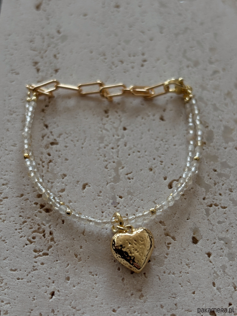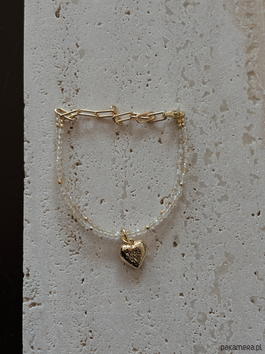 Bransoletka wykonana jest na lince jubilerskiej z kamieni cytrynu fasetowanego, zapięcia, zawieszki i łańcuszka rodowanych złotem.