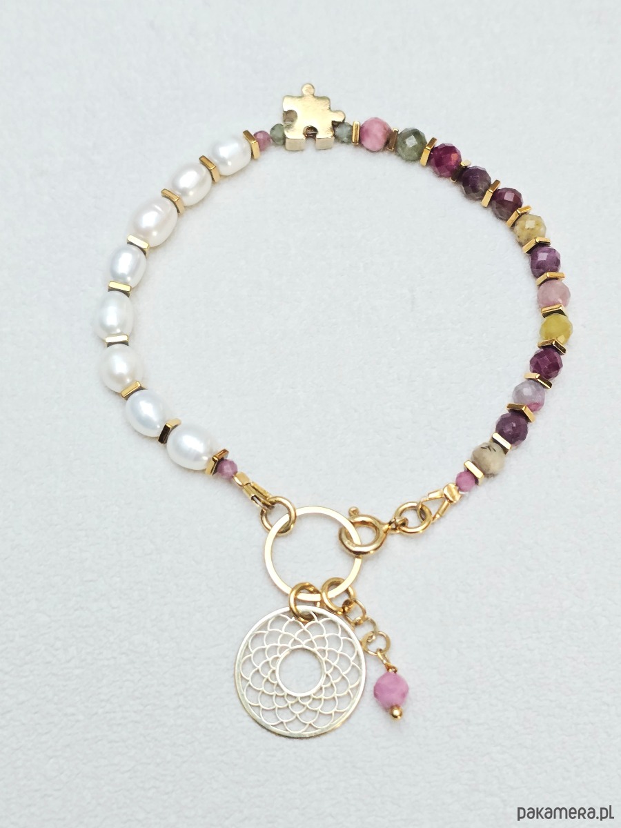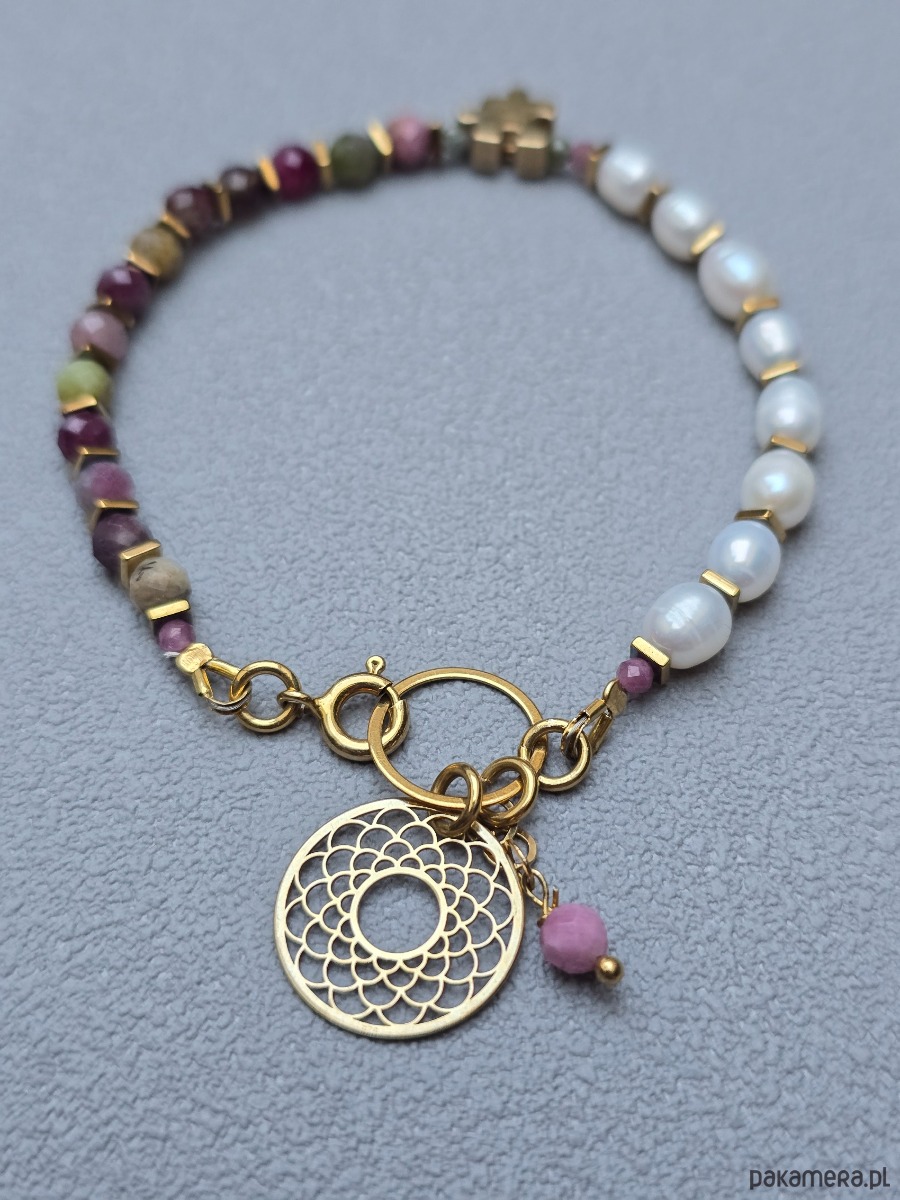 Śliczna bransoletka wykonana z kolorowych turmalinów i pereł naturalnych.