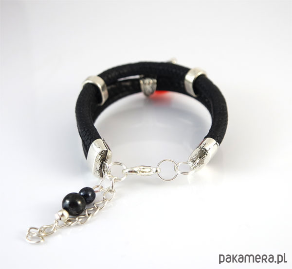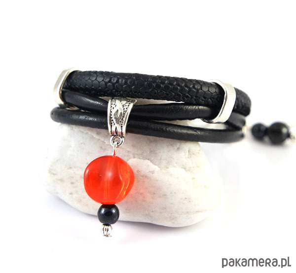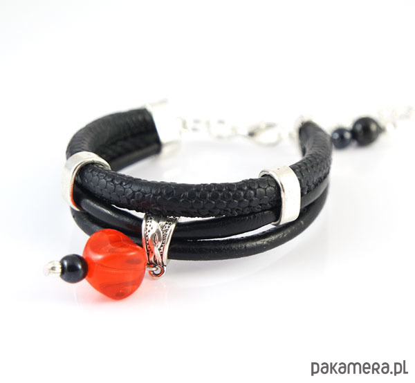 Bransoletka zrobiona jest z rzemieni ze skóry ekologicznej i naturalnej oraz ozdobnego szklanego koralika w pomarańczowym odcieniu.