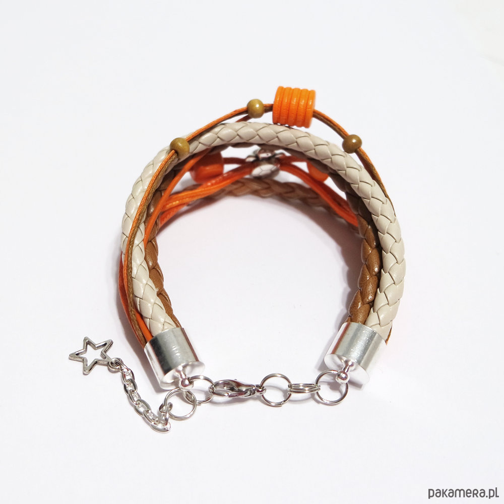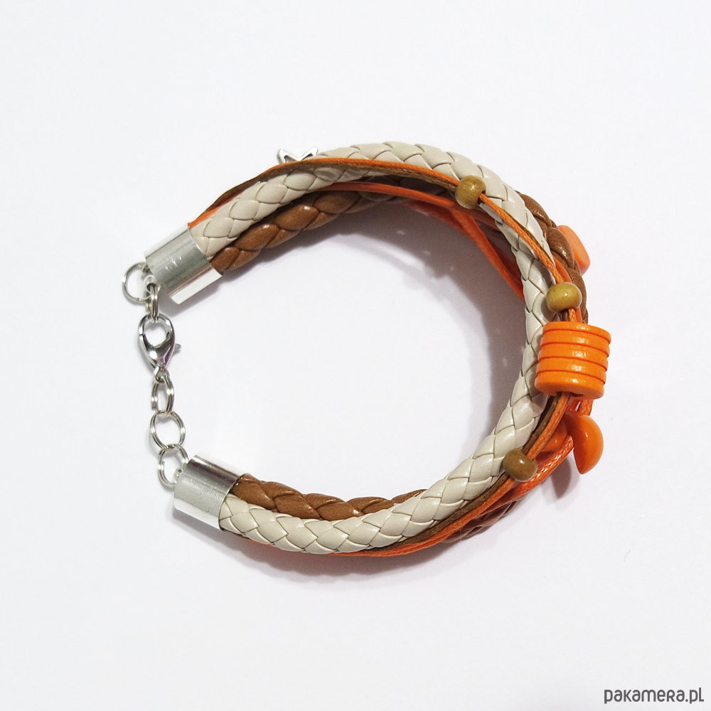 Bransoletka zrobiona jest z rzemieni z eko-skóry, skóry, sznurka, koralików oraz przekładek.