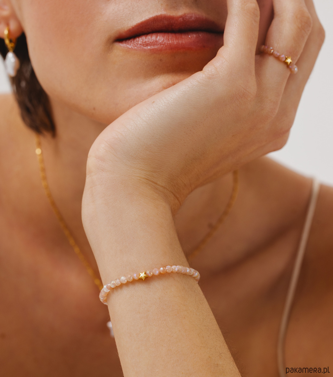 Idealna, jeśli szukasz subtelnego prezentu, który łączy delikatność i symbolikę. Naturalne kamienie — iolit w kolorze nocnego nieba lub kamień słoneczny o ciepłej, opalizującej barwie — tworzą harmonijną kompozycję z gwiazdką, symbolem nadziei i marzeń.
