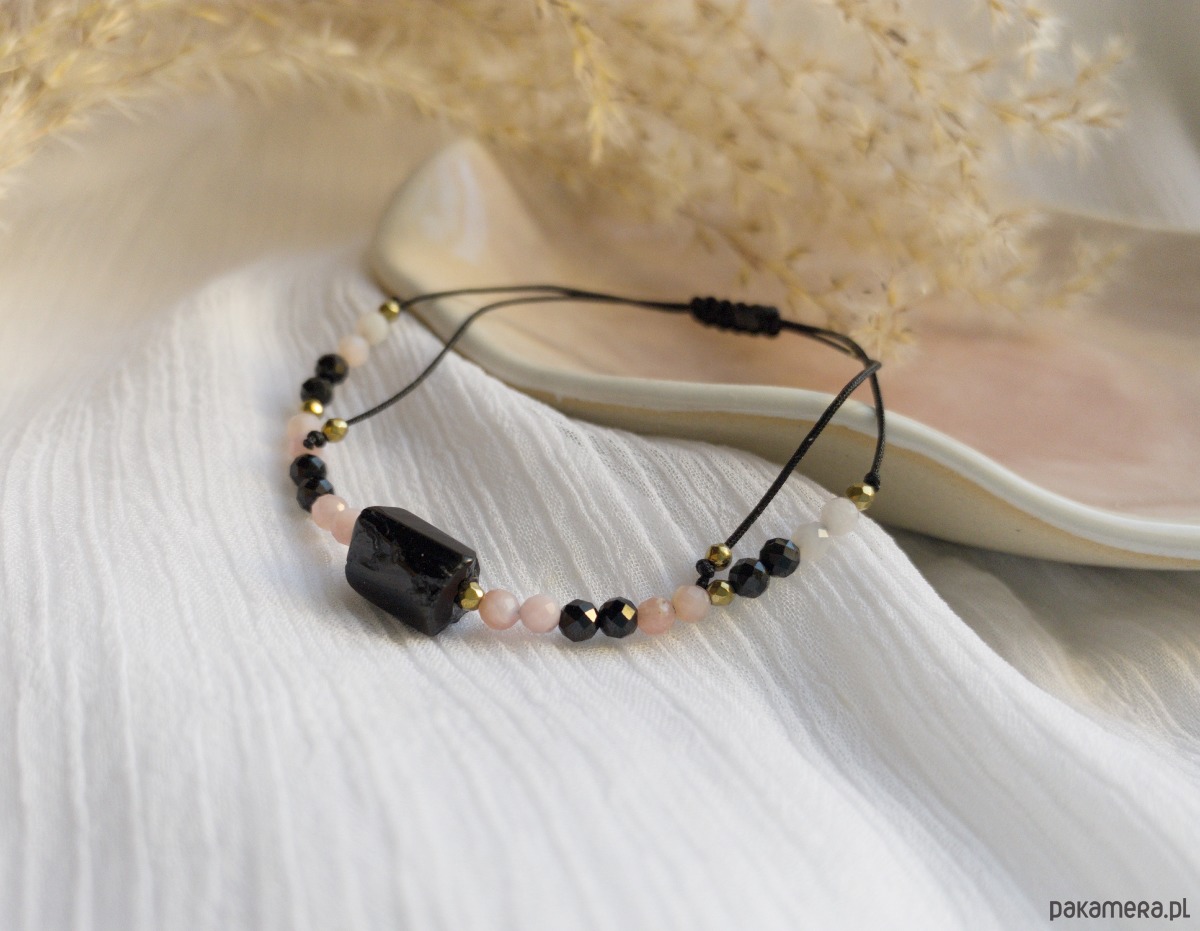 Bransoletka z Różowym Opalem oraz Czarnym Turmalinem na czarnym nylonowym sznureczku jubilerskim.