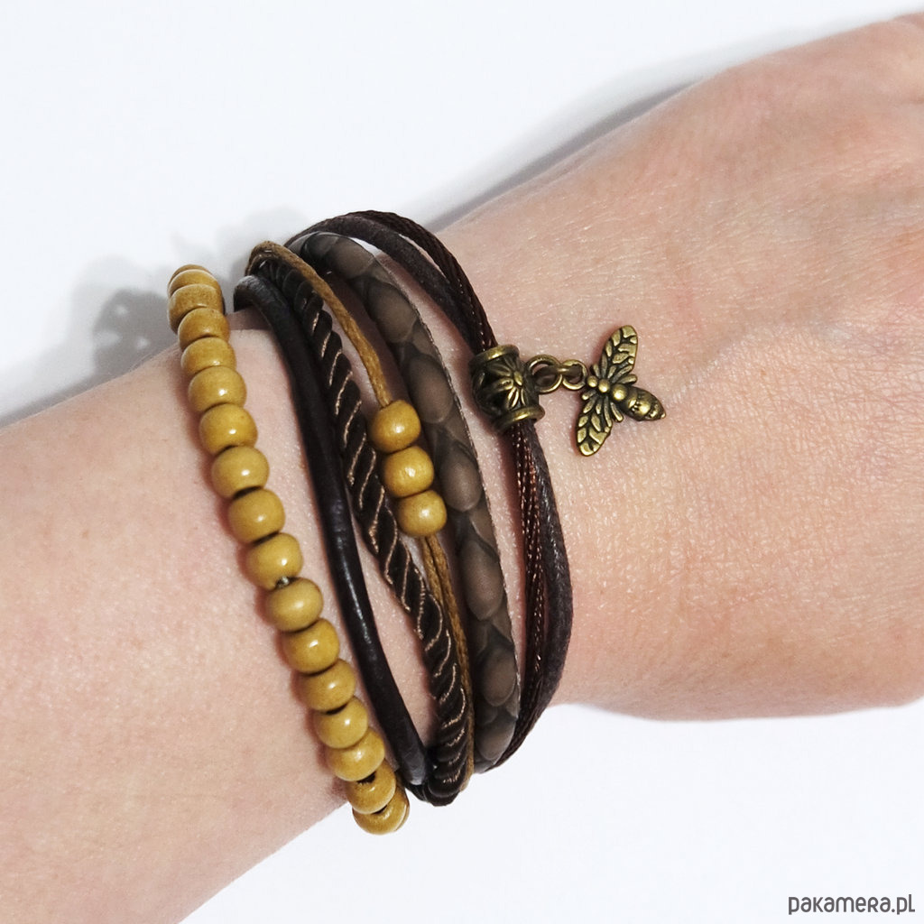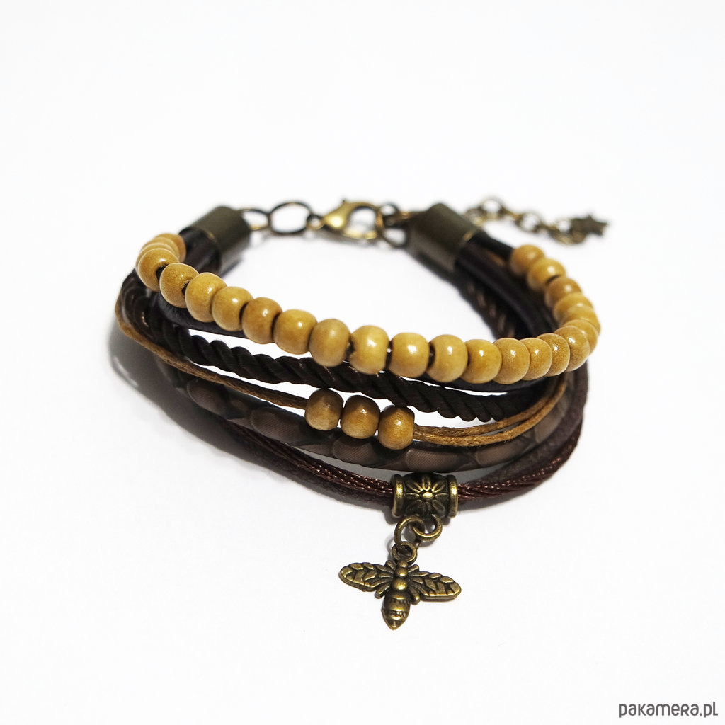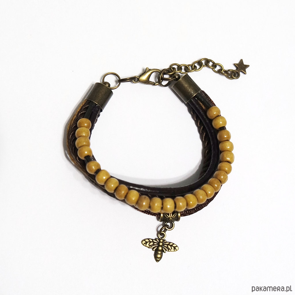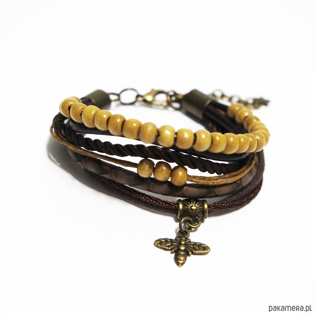 Bransoletka zrobiona jest z rzemieni ze skóry ekologicznej, naturalnej, sznurków i zawieszki oraz drewnianych koralików.