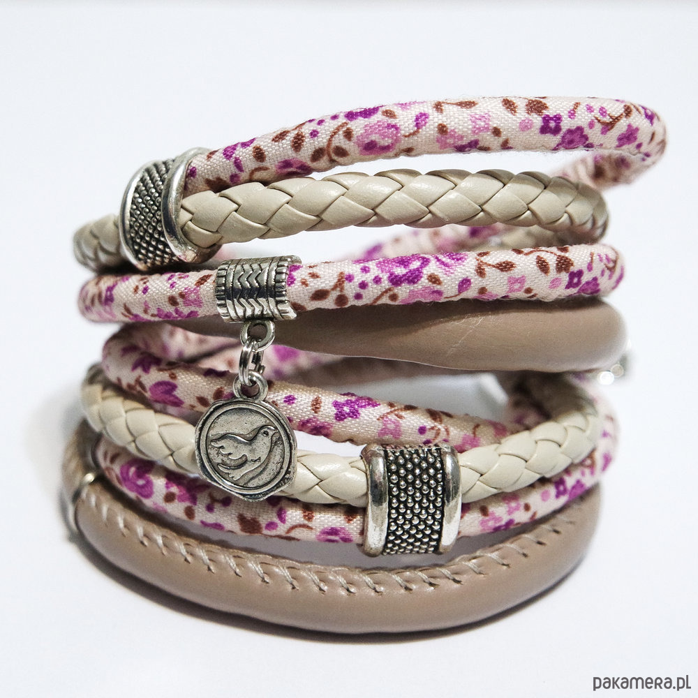 Bransoletka - Ptaszek - rzemienie, owijana, kwiaty