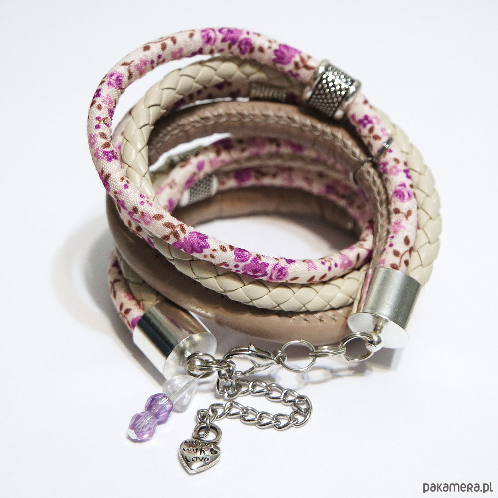 Bransoletka wykonana jest z rzemieni z eko-skóry oraz materiału.