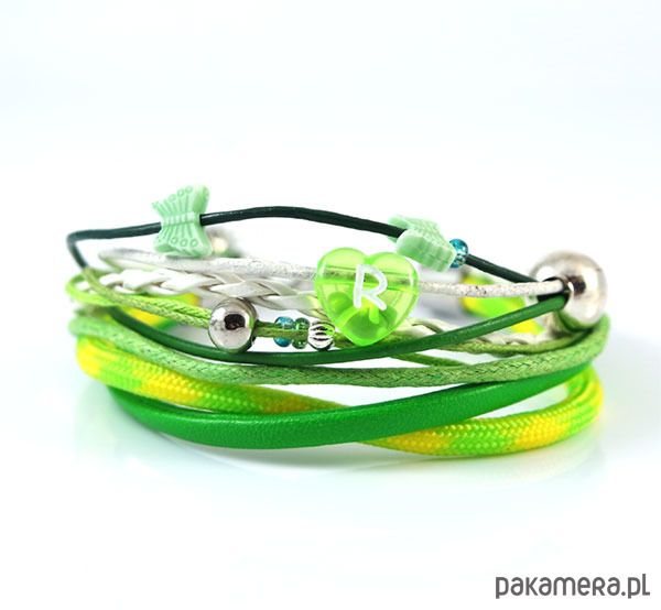 Bransoletka zrobiona jest z rzemieni ze skóry ekologicznej, naturalnej, sznurków oraz koralików.