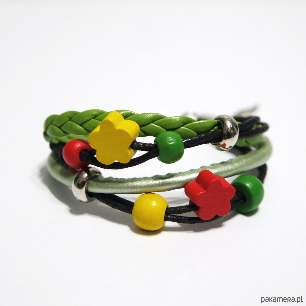Bransoletka zrobiona jest z woskowanych sznurków, rzemieni z ekoskóry oraz drewnianych i akrylowych koralików.