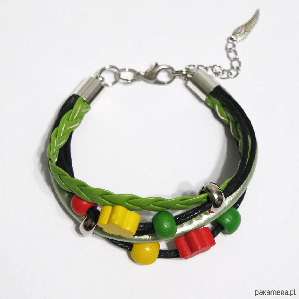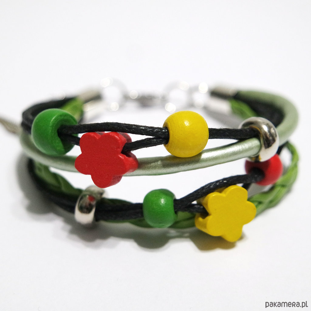 Bransoletka zrobiona jest z woskowanych sznurków, rzemieni z ekoskóry oraz drewnianych i akrylowych koralików.