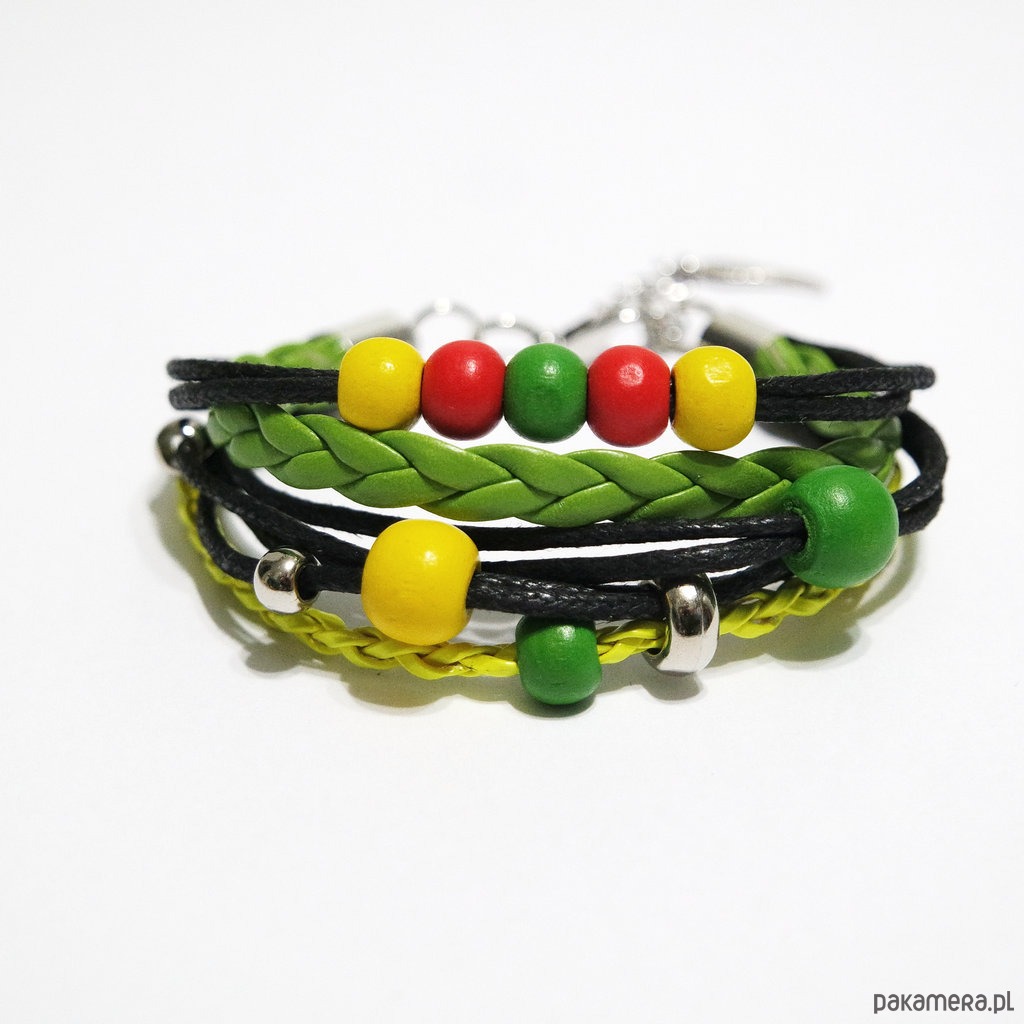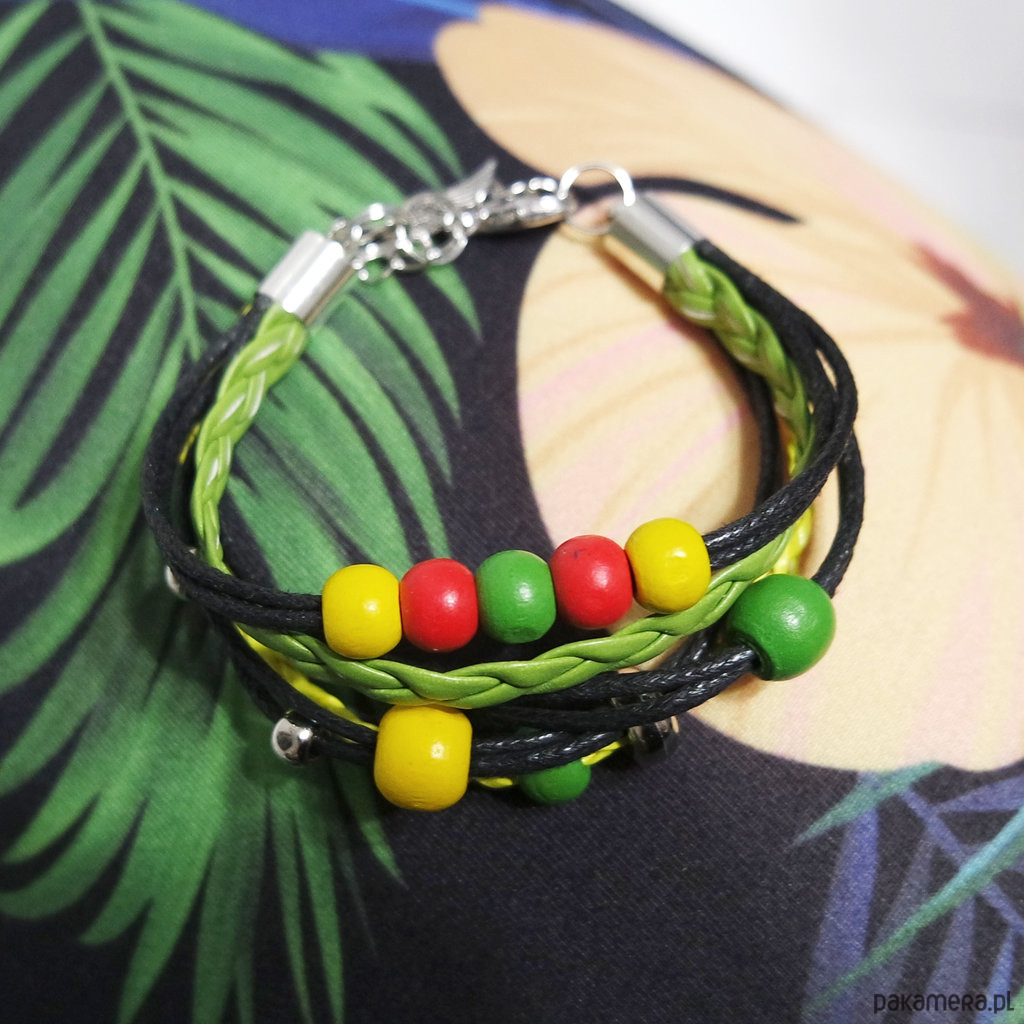 Bransoletka zrobiona jest z woskowanych sznurków, rzemieni z ekoskóry oraz drewnianych i akrylowych koralików.