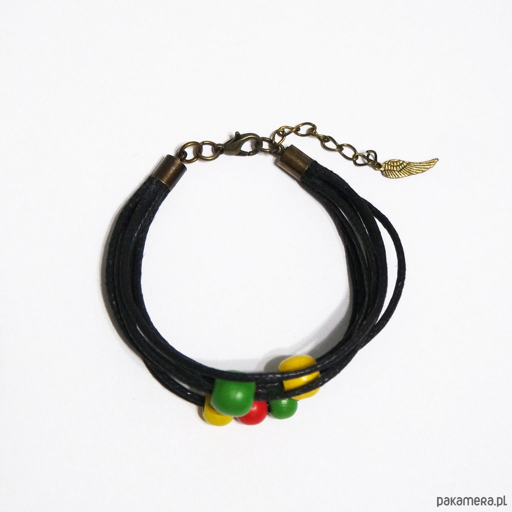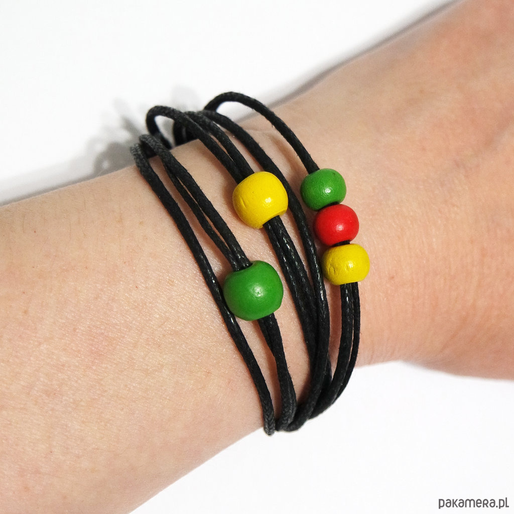 Bransoletka zrobiona jest z woskowanych sznurków oraz drewnianych koralików.