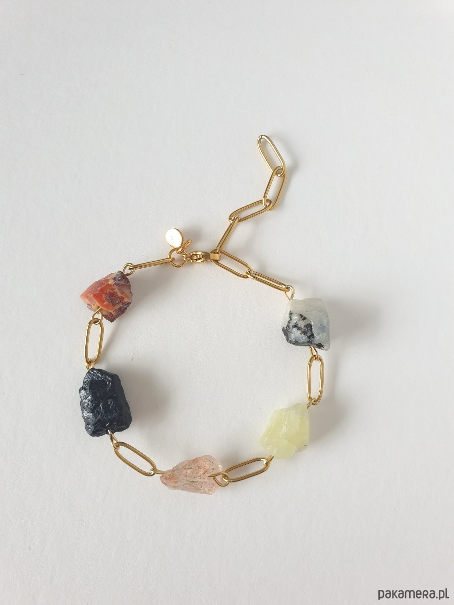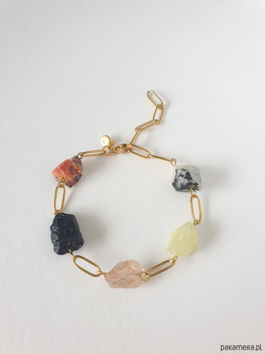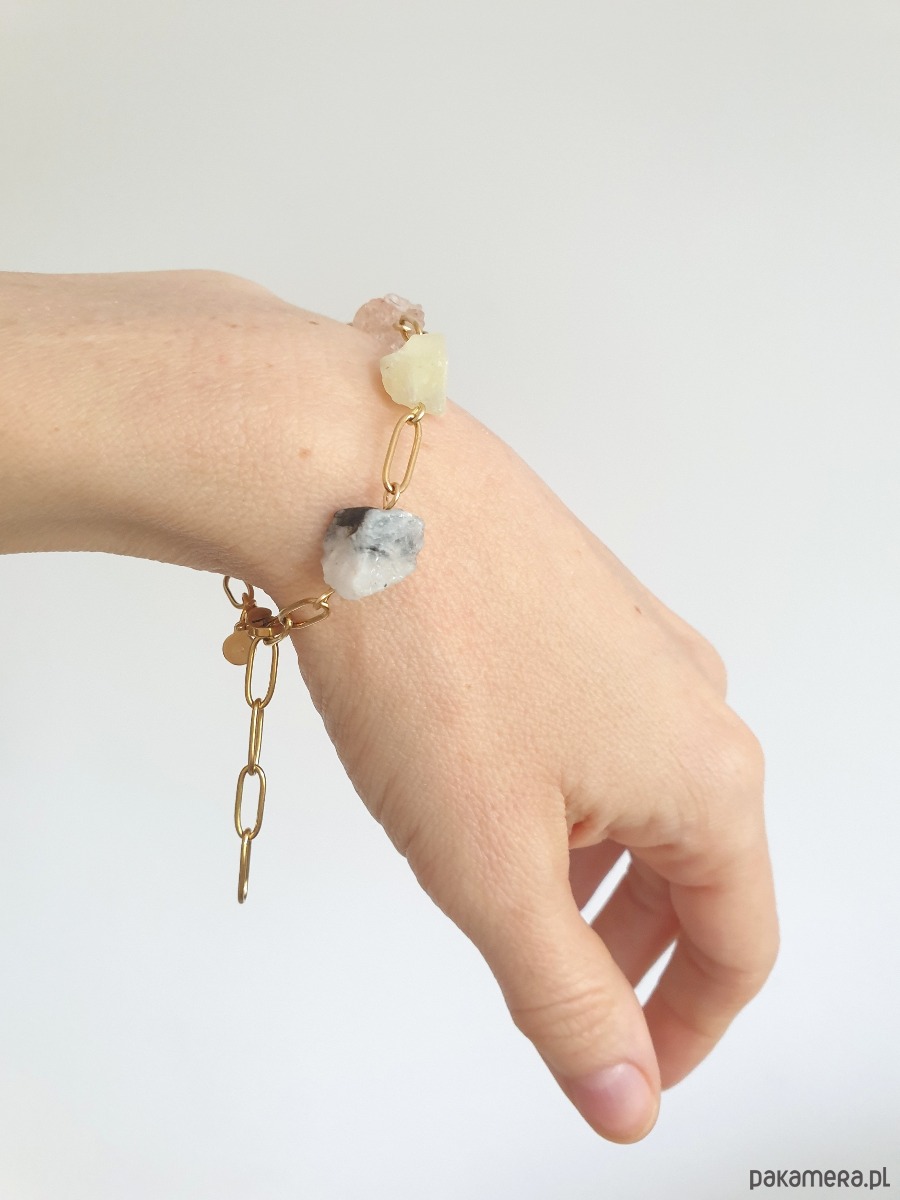 Delikatna bransoletka z kolekcji RAW tworzona ręcznie z łańcuszka i elementów ze stali szlachetnej pozłacanej z kamieniami naturalnymi, surowymi, tutaj phrenit,czarny turmalin, opal ognisty, kamień księżycowy, kwarc truskawkowy.