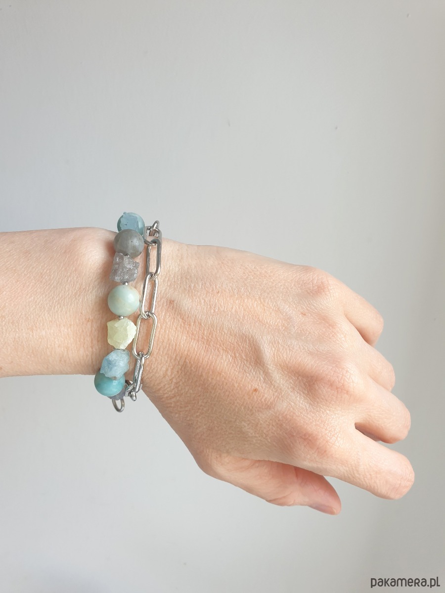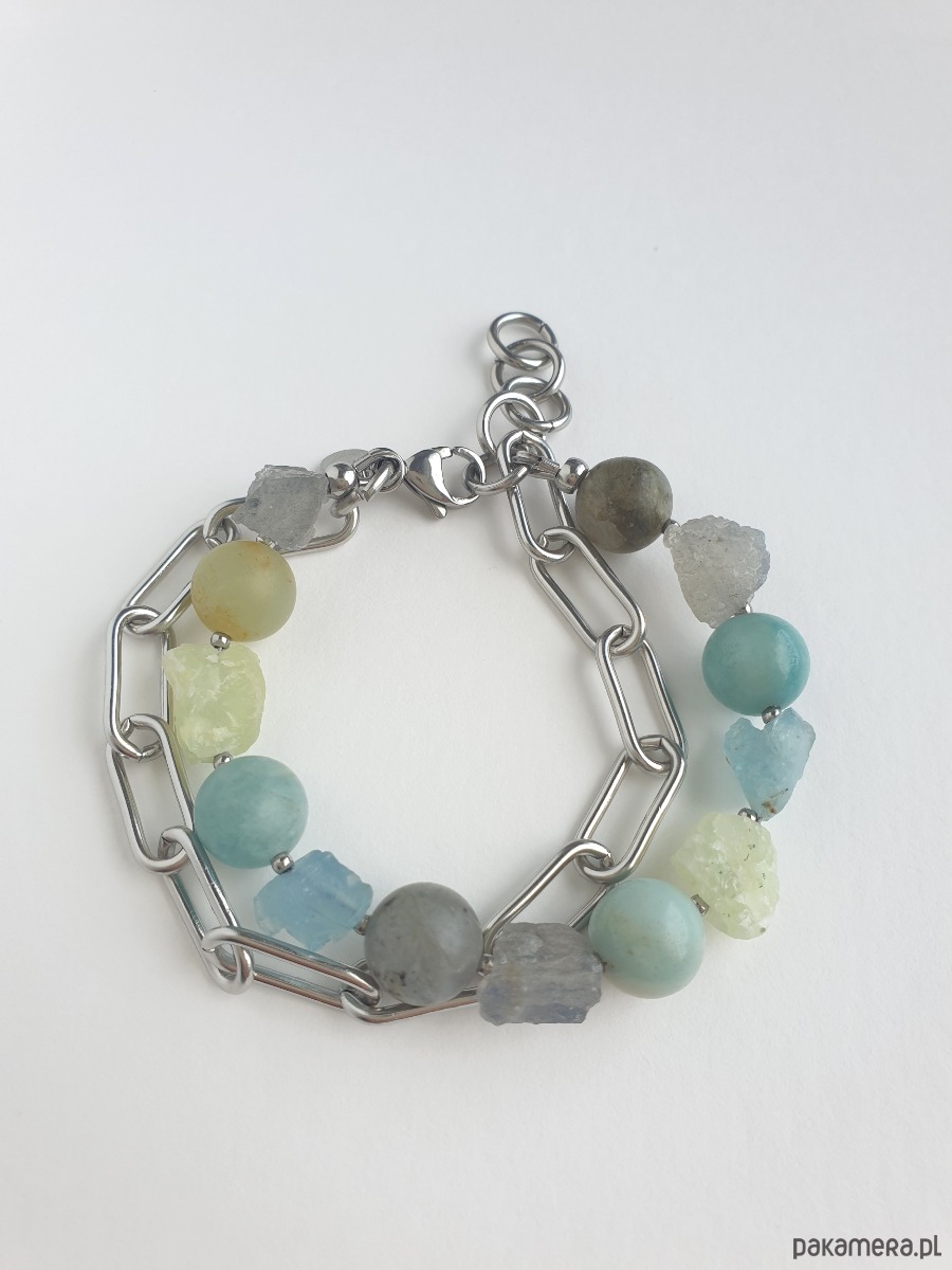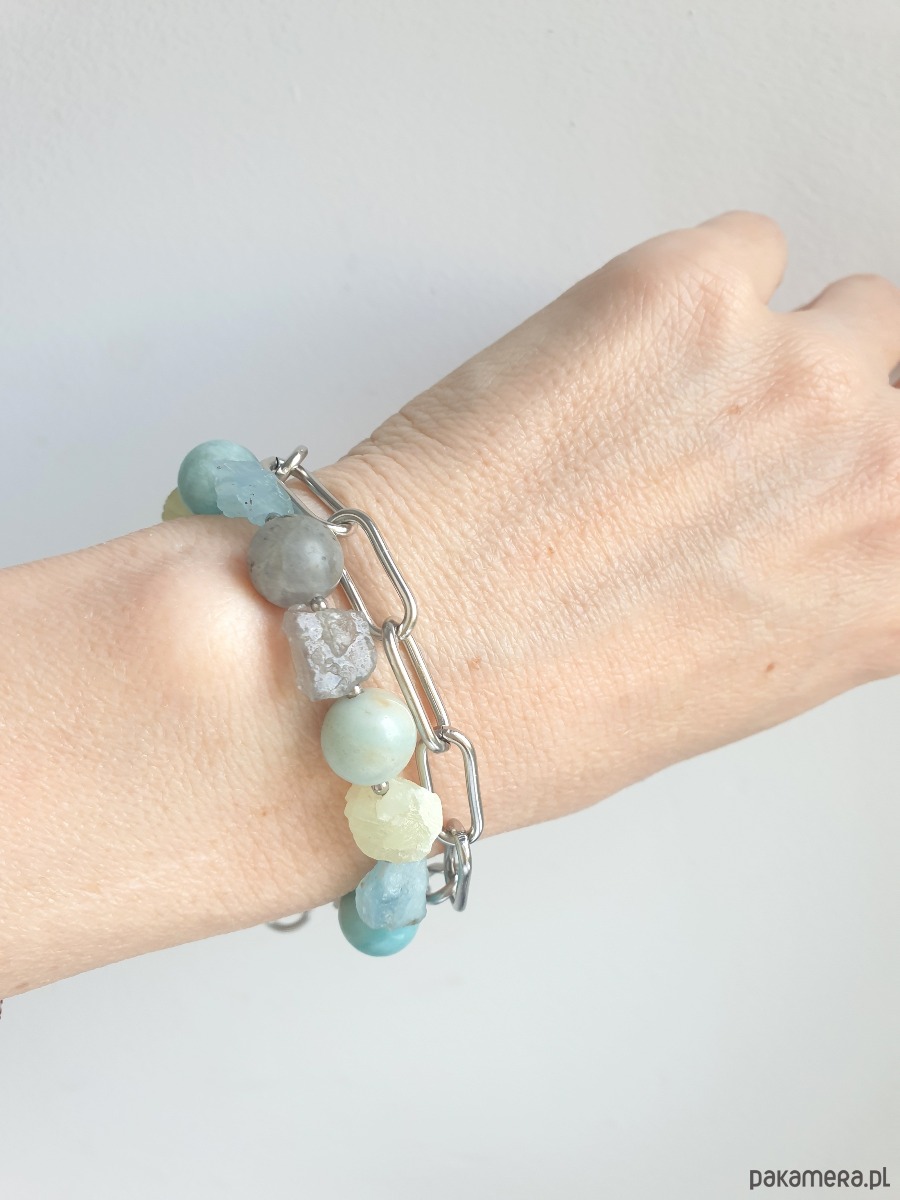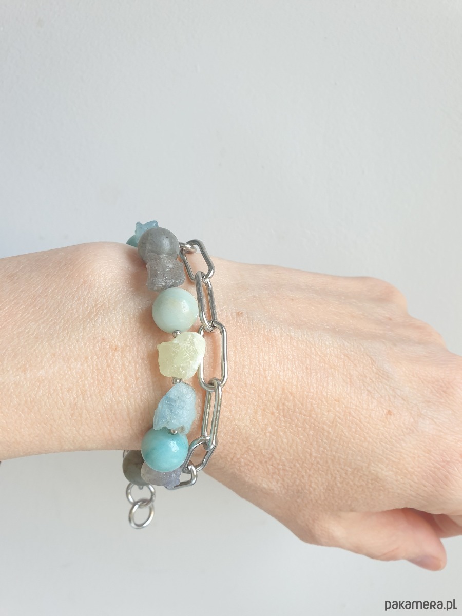 Bransoletka RAW z grubym łańcuchem, akwamaryn, amazonit, labradoryt, phrenit